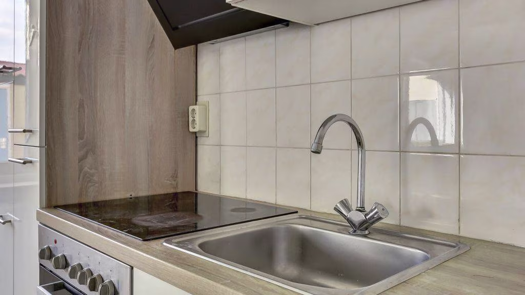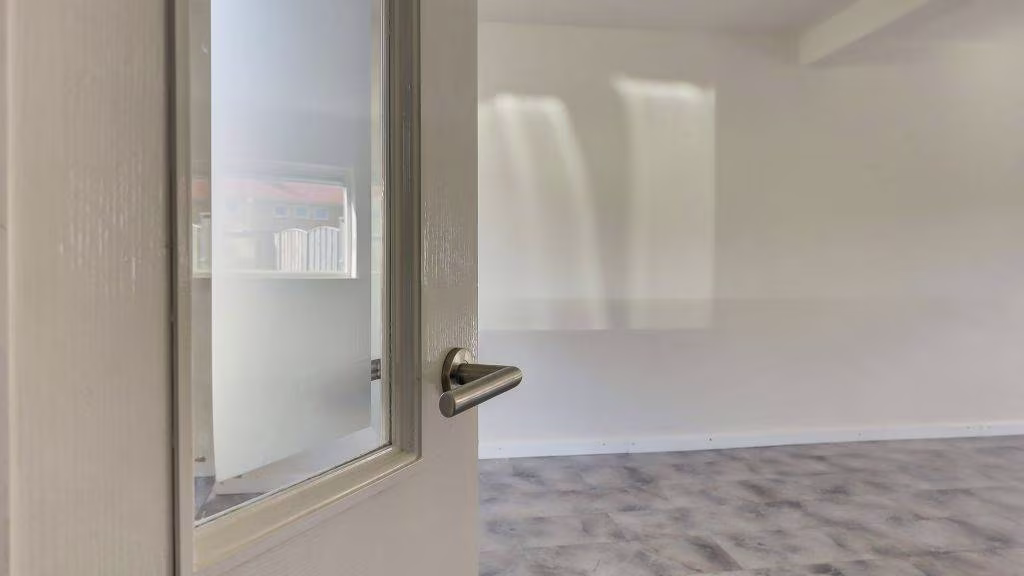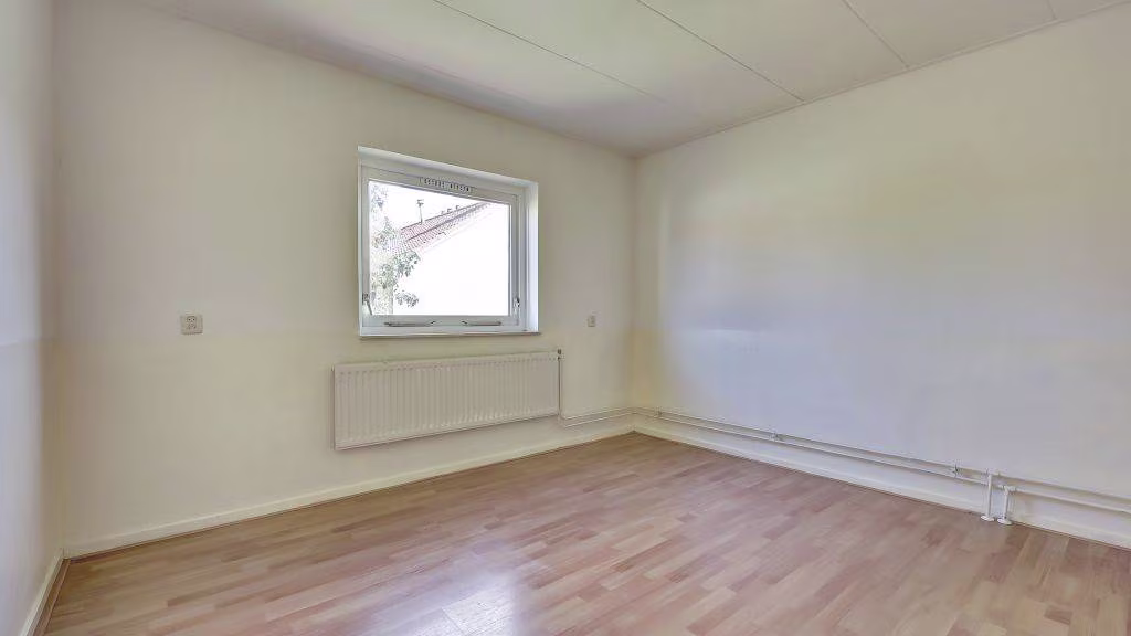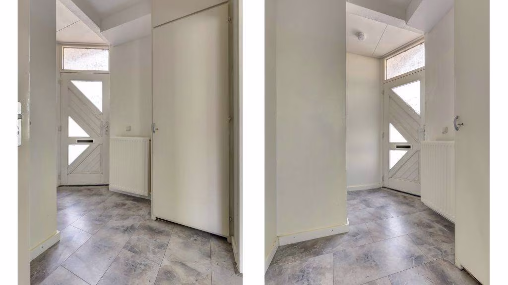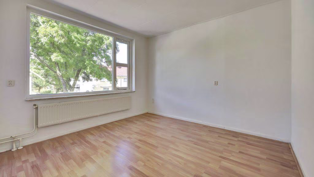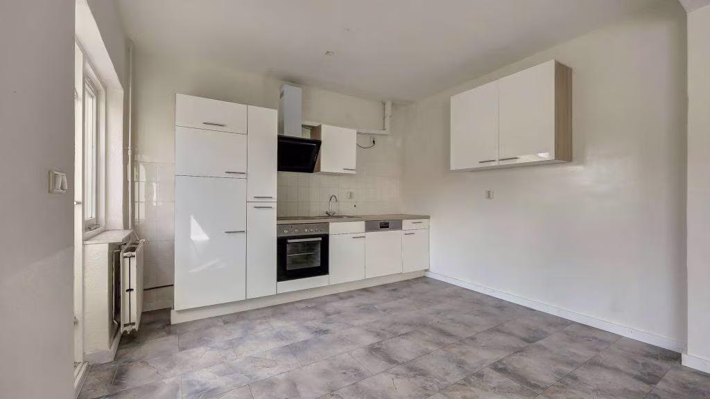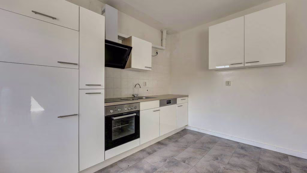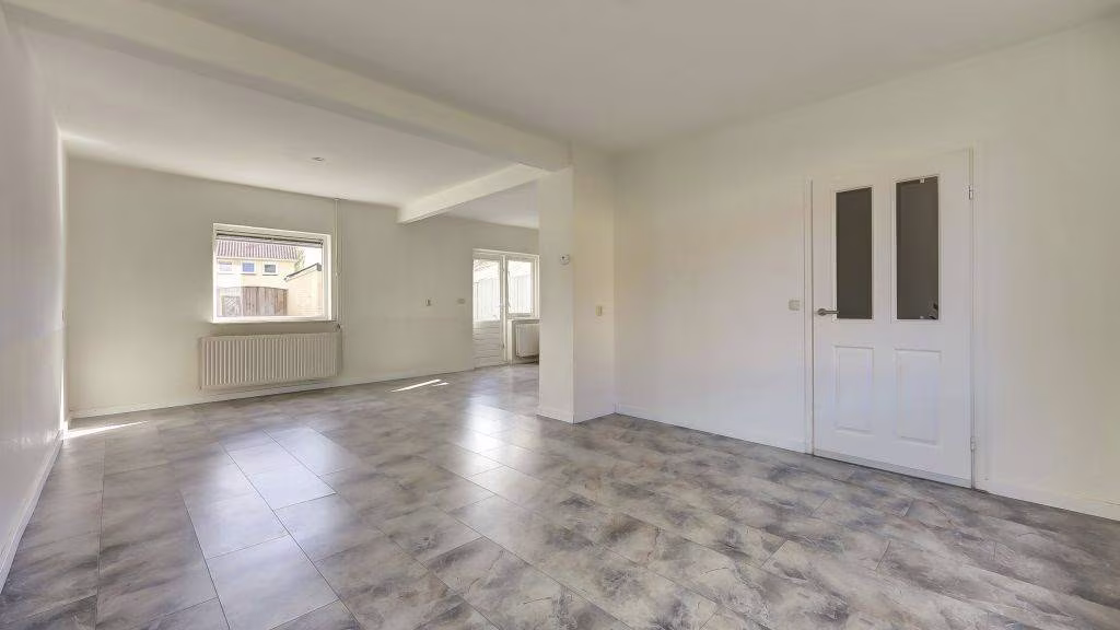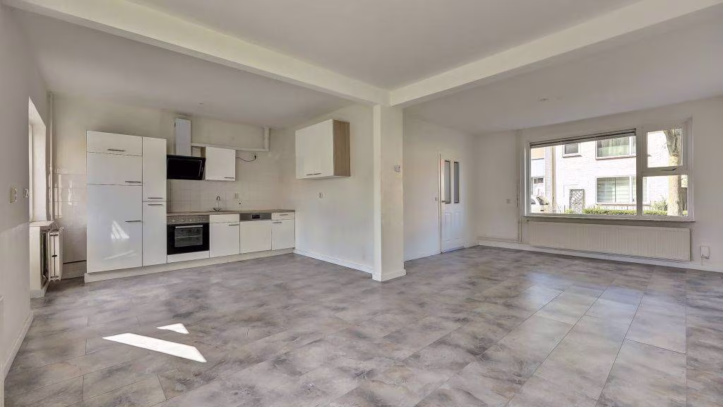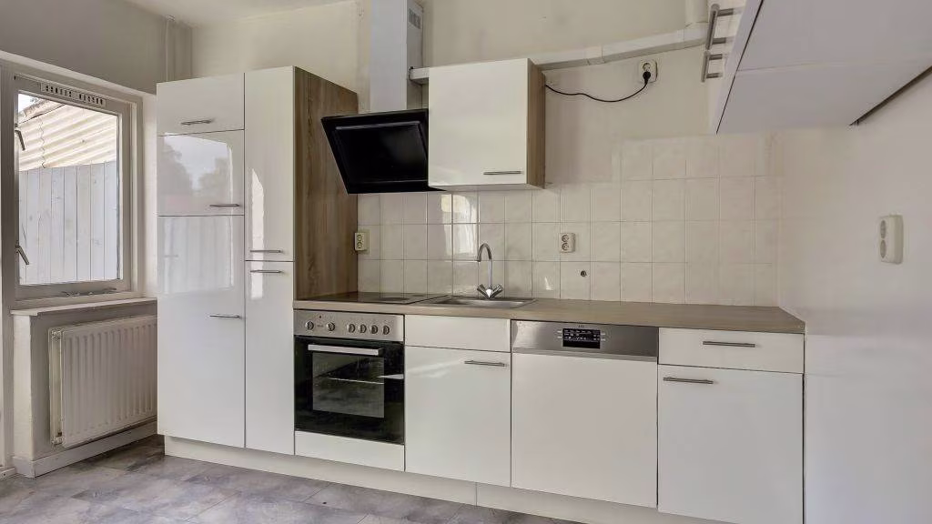 Entree, hal, meterkast, toiletruimte en cv-ketel. L-vormige woonkamer met keukenblok voorzien van oven, inductiekookplaat, koelkast en afzuigkap.