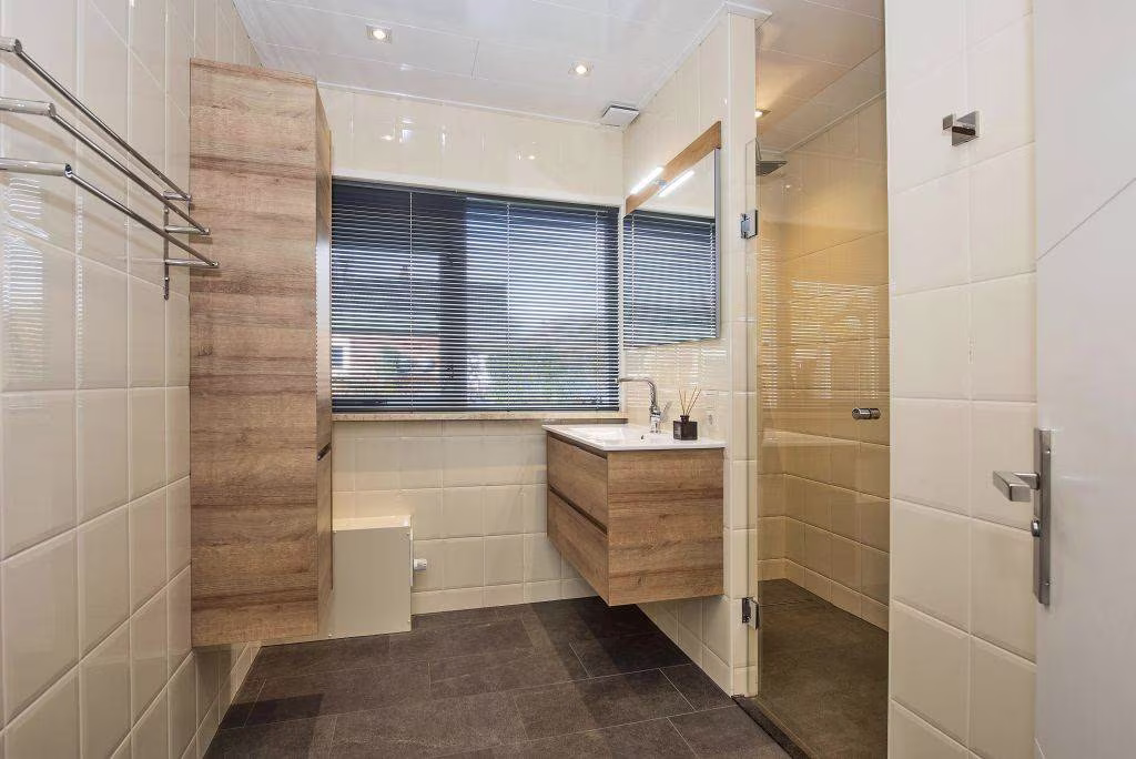 De badkamer bevindt zich op de begane grond en is voorzien van een ruime inloopdouche, vloerverwarming en een stijlvol wastafelmeubel. Dat maakt de woning extra comfortabel en wanneer je een uitbouw zou plaatsen met een slaapkamer ook nog levensloopbestendig.