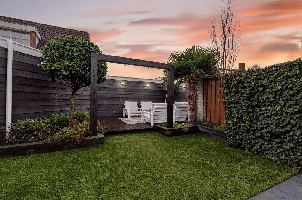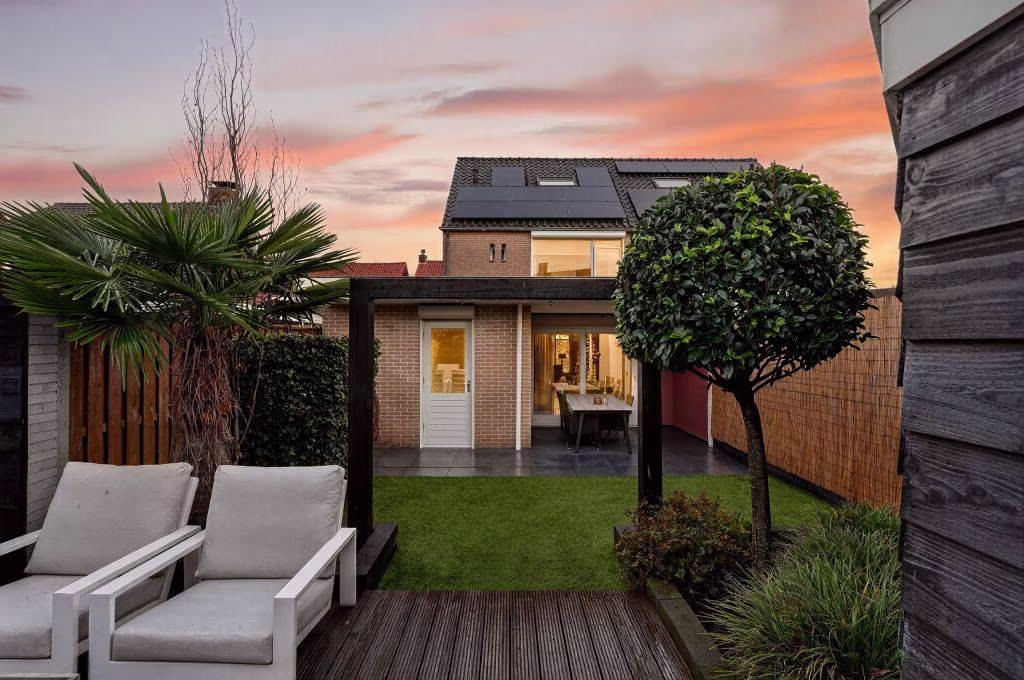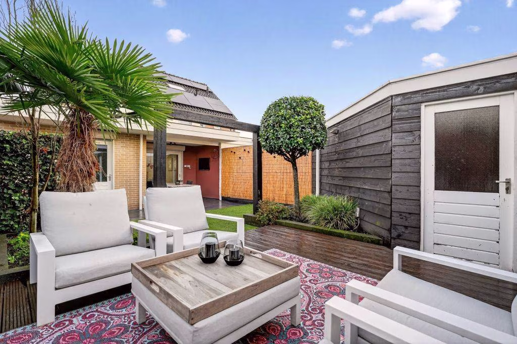 De tuin sluit perfect aan op de leefkeuken en vormt een sfeervolle buitenruimte met een royale, verlichte overkapping, meerdere terrassen en een onderhoudsvriendelijke, groene indeling.