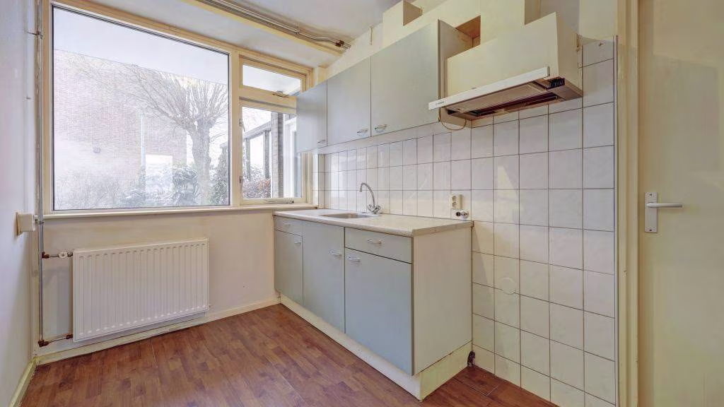 Entree/hal, zonnige woonkamer met laminaat vloer en vaste kast, keuken met laminaat vloer en doorloop naar berging met CV opstelplaats en wasmachine aansluiting en vaste kast.
