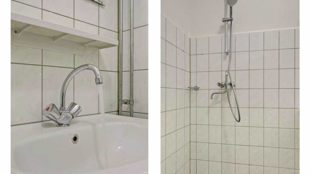 Doucheruimte met douche, enkele wastafel en toilet, 2 slaapkamers, beiden voorzien van laminaat vloeren en een met doorloop naar buitenterras.