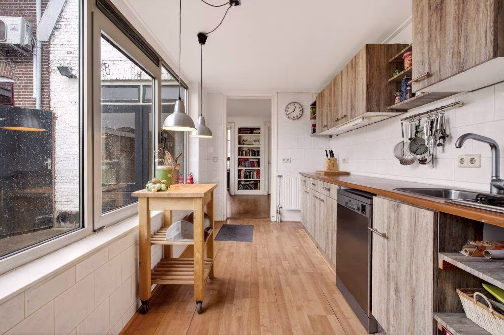 Via de entree komt u in de hal met toegang tot de eetkamer en de woonkamer. De woonkamer is voorzien van een betonvloer met vloerverwarming, wat zorgt voor een aangenaam wooncomfort. De eenvoudige, dichte keuken bevindt zich aan de achterzijde van de woning en biedt toegang tot de diepe achtertuin.