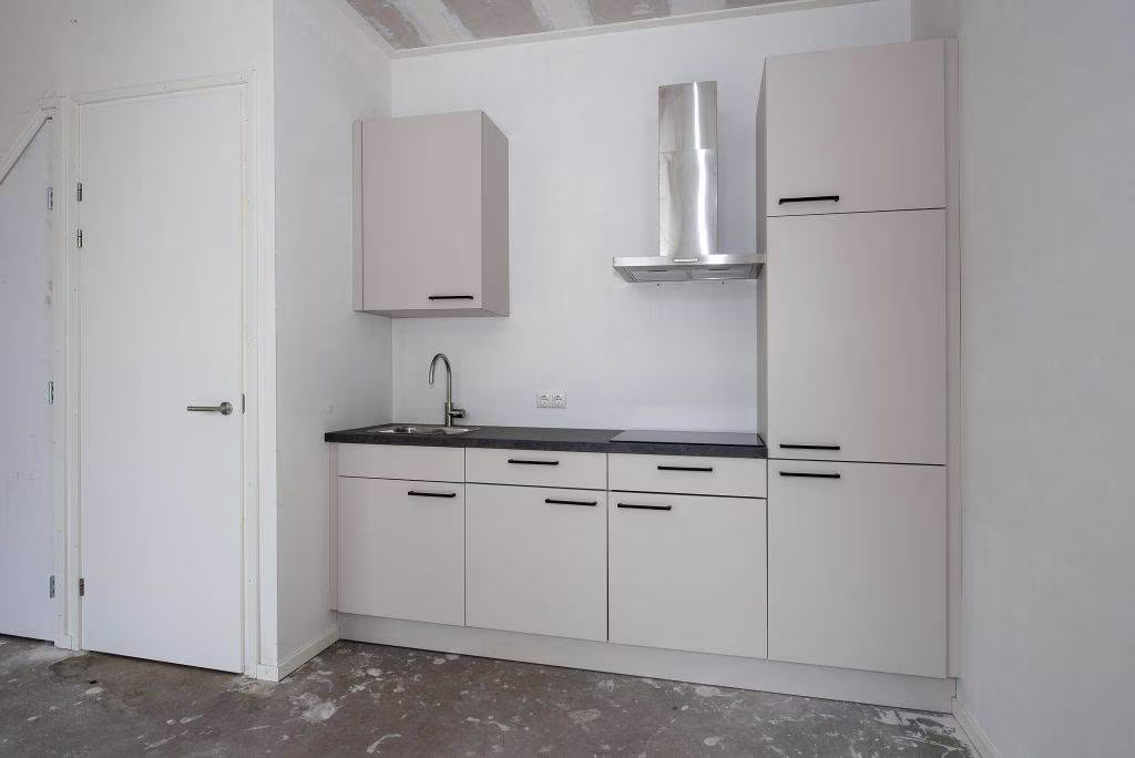 - Royale (± 35 m²) woonkamer met trapkast en open keuken v.v. inductie-kookplaat, afzuiging en koelkast;