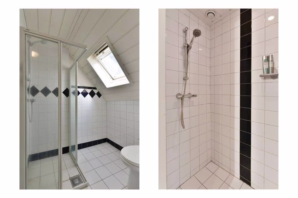 1e verdieping: Overloop, 1 slaapkamer, badkamer, extra doucheruimte.