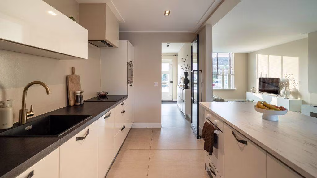Entree, hal, toiletruimte, meterkast, trapopgang, provisieruimte, moderne open keuken met inbouwapparatuur, uitgebouwde woonkamer met openhaard en prachtig vrij uitzicht, schuifpui naar de achtertuin, bijkeuken met kastenwand en deur naar achtertuin.