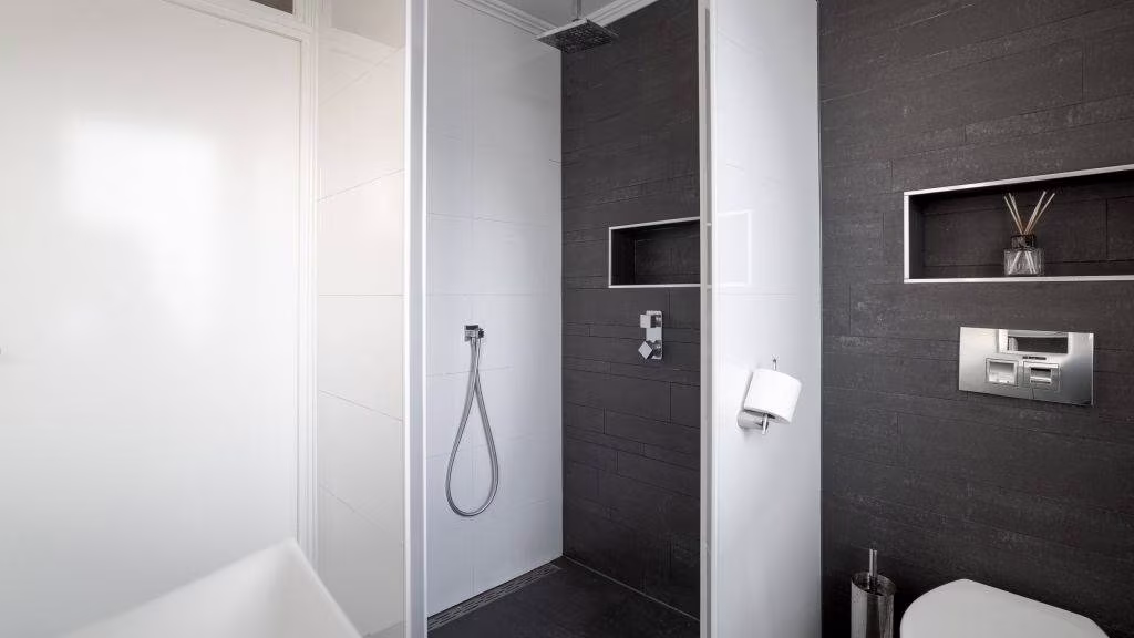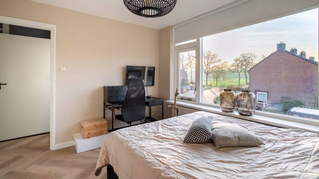 De ruime overloop geeft toegang tot drie ruime slaapkamers waarvan twee met vaste kasten. De moderne badkamer is compleet ingericht met een inloopdouche, wastafelmeubel en een toilet.