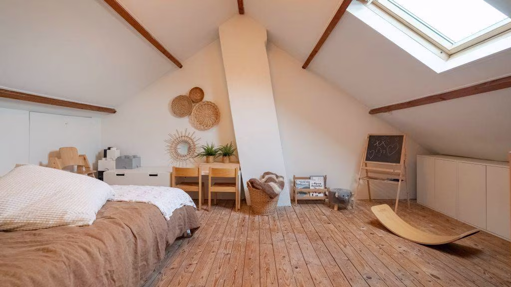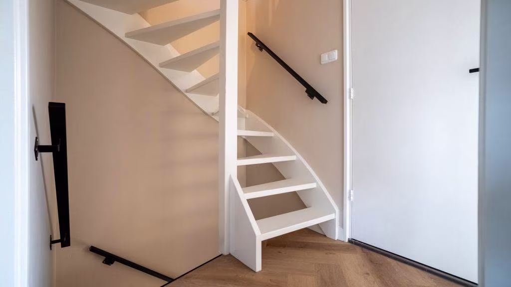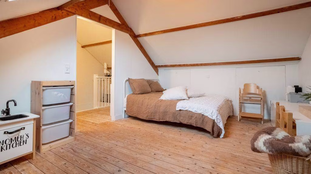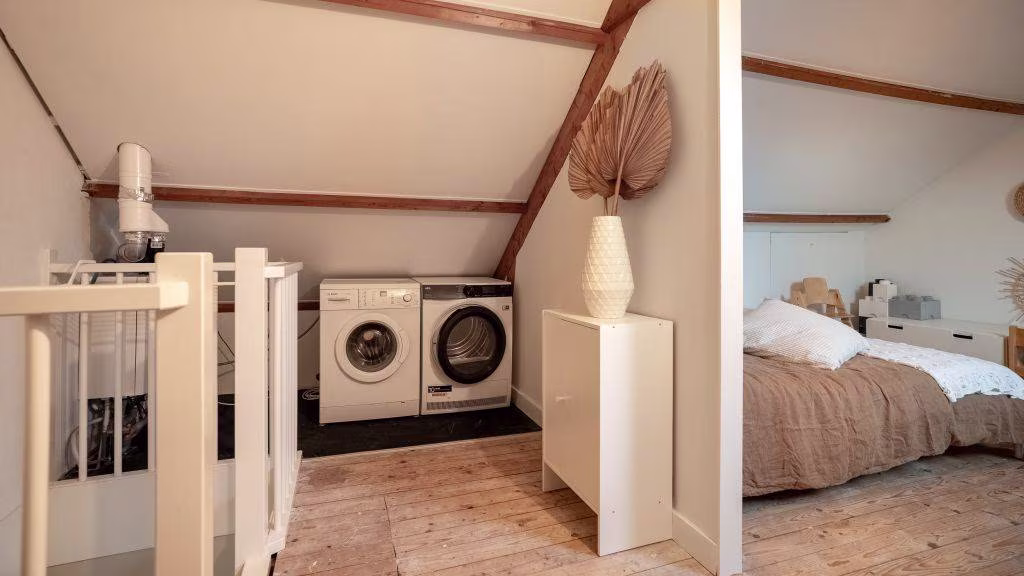 Vaste trap naar overloop met opstelplaats cv ketel en witgoedapparatuur, doorloop naar ruime zolderkamer met dakraam en veel bergruimte achter de schuine kanten.