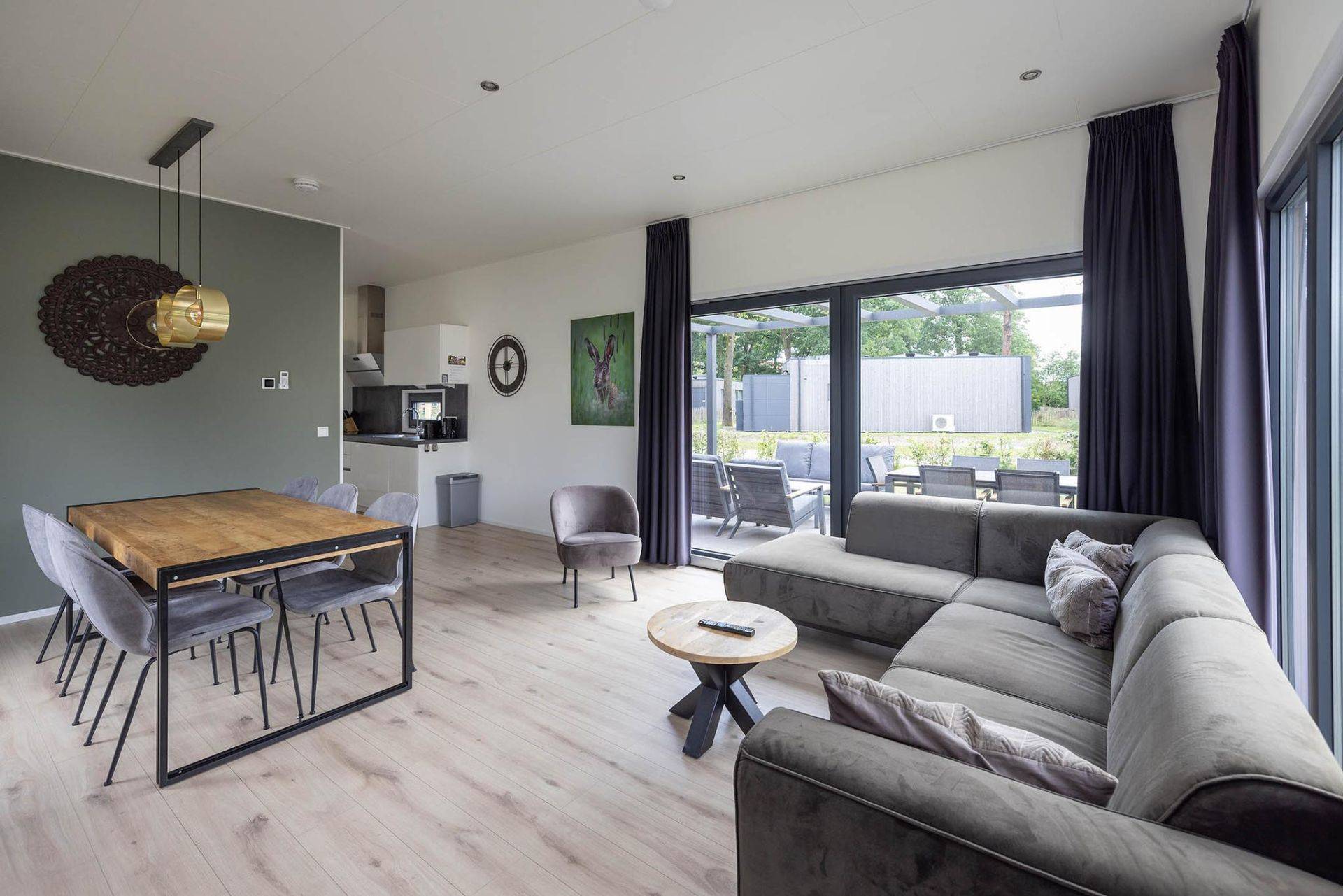 Bij binnenkomst in de hal vind je recht tegenover de ingang de deur naar het toilet. Aan de rechterzijde bevindt zich een slaapkamer met een tweepersoonsbed, evenals de badkamer die is voorzien van een luxe inloopdouche, een wastafel en een designradiator. Aan de andere kant van de hal tref je de moderne open keuken, compleet uitgerust met een inductiekookplaat, afzuigkap, vaatwasser, koelkast en combi-oven. Tegenover de keuken liggen de twee overige slaapkamers, beide ingericht met twee eenpersoonsbedden. Vanuit de keuken loop je door naar de ruime, sfeervolle woonkamer met airconditioning en een schuifpui naar het terras, waar je in alle rust kunt genieten van de natuurlijke omgeving.
