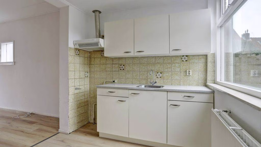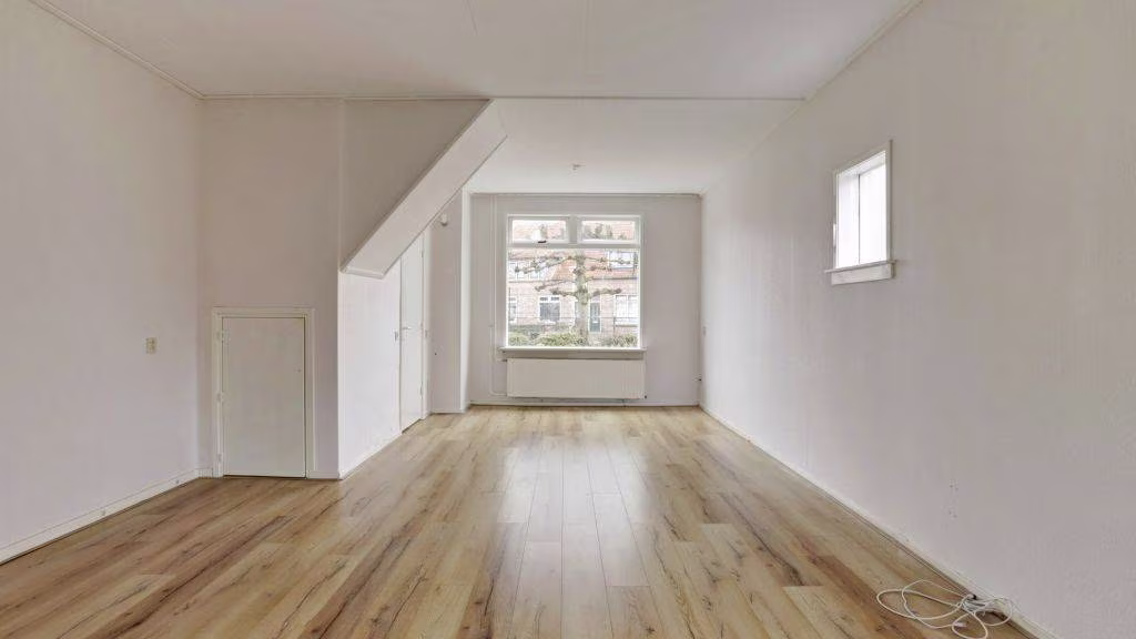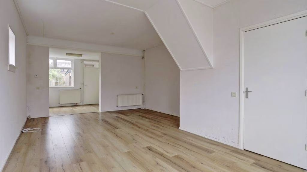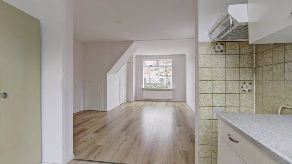 Entree, hal, meterkast. Woonkamer met directe verbinding tot keukenruimte. Achterportaal naar badkamer, toilet en opstelplaats cv-ketel met witgoed apparatuur aansluitingen.