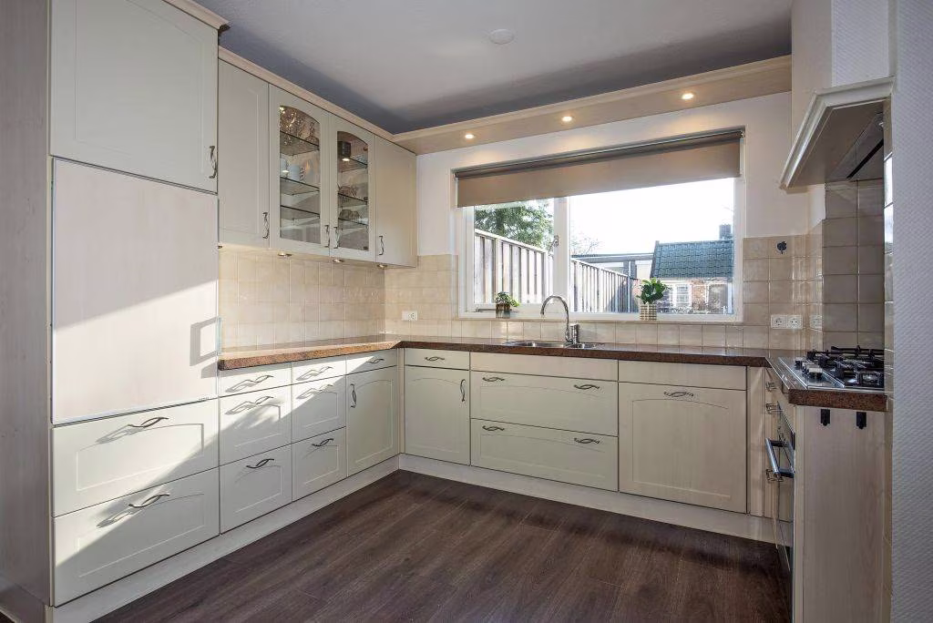 Via de zijkant van deze eindwoning heb je toegang tot de overkapte voordeur van de woning alsook naar de berging, hierover later meer. Laten we eerst de woning betreden via de voordeur, waarnaast een groot zijraam zit dat zorgt voor daglicht in de hal. Binnenkomend valt op hoe royaal en opgeruimd de hal aanvoelt. Er is meer dan genoeg ruimte voor een kapstok en andere praktische zaken. De glazen deur die recht tegenover de voordeur staat, geeft meteen een uitnodigende doorkijk naar de living. Via die deur stap je er de open U-vormige keuken binnen, met ramen boven het aanrechtblad die uitzicht bieden over de tuin. Het is een landelijke keuken met crèmekleurige kasten en decoratieve handgrepen, afgewerkt met een granieten werkblad en een bijpassende betegelde achterwand. De keuken is uitgerust met een gasfornuis, combimagnetron en geïntegreerde koelkast, waardoor alles binnen handbereik is. In het hart van de living is volop ruimte voor een grote eettafel. De zithoek is gecreëerd rondom de authentieke open haard. De donkere houten vloer en de grote ramen aan de voor- en achterzijde geven de ruimte samen een rustige en vriendelijke sfeer, waardoor het geheel prettig aanvoelt. Op de begane grond in de hal bevindt zich tevens de meterkast, de trapopgang naar de eerste verdieping en de doorgang naar een extra hal, die prima gebruikt kan worden als bijkeuken. In deze ruimte is een nis met de aansluiting voor de wasmachine. Tevens tref je hier het toilet. Daarnaast heb je via deze ruimte toegang tot de achtertuin. In de achtertuin is ook toegang tot de berging die eveneens te bereiken is via de voorzijde van de woning. In deze berging is nog een wasmachineaansluiting aanwezig, waardoor deze ruimte meerdere functies kan vervullen.