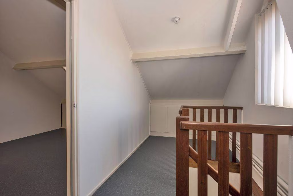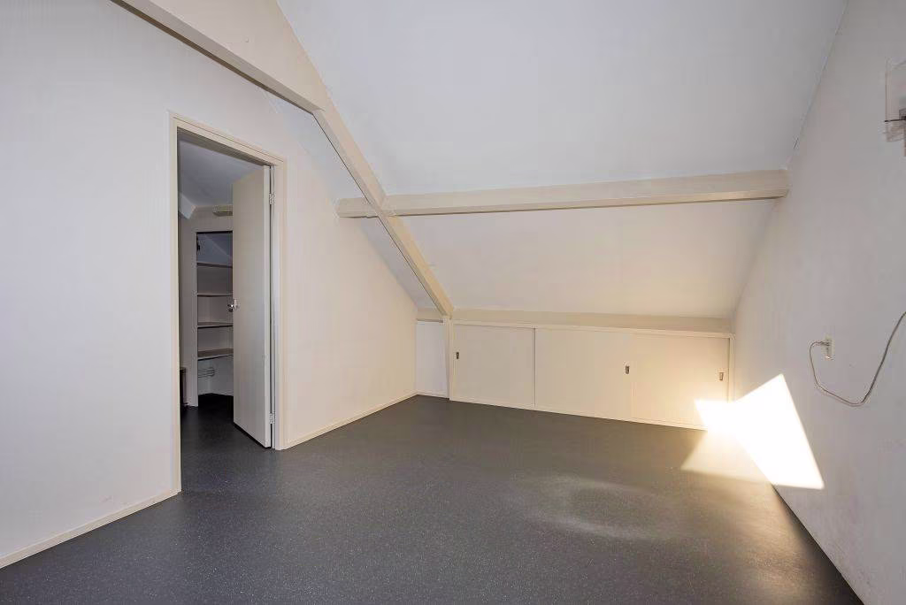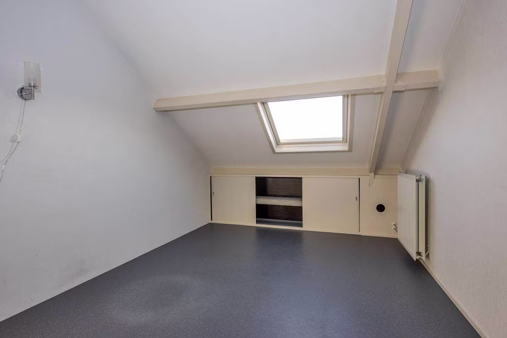 Via een vaste trap kom je uit op de overloop van de zolder. Achter het schot bevindt zich een handige opbergruimte, ideaal voor spullen die je uit het zicht wilt opbergen en niet dagelijks nodig hebt. Daarnaast is er een kamer met een dakraam dat de ruimte vult met natuurlijk licht. Deze kamer is veelzijdig in te richten, bijvoorbeeld als extra slaapkamer, werkkamer of hobbyruimte, en biedt daarmee volop mogelijkheden om de zolder volledig naar eigen wens te benutten.