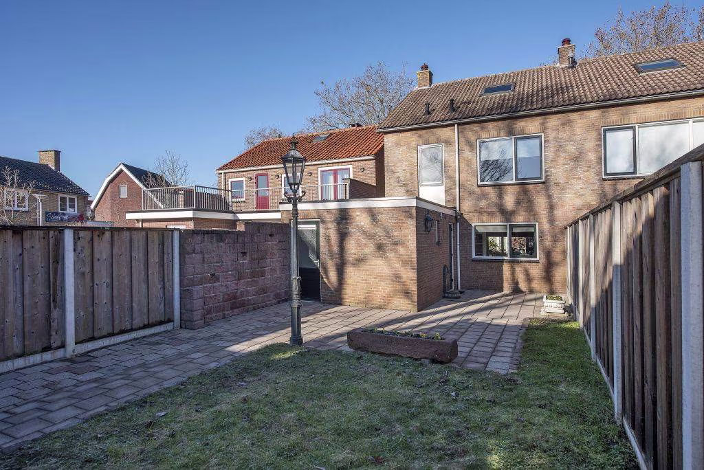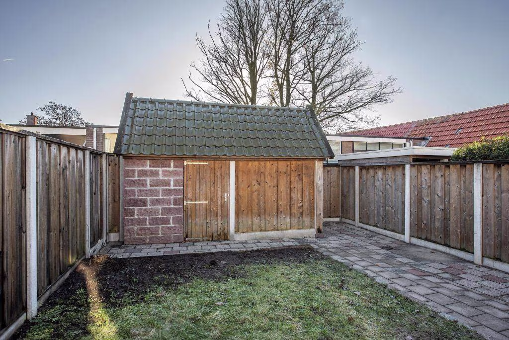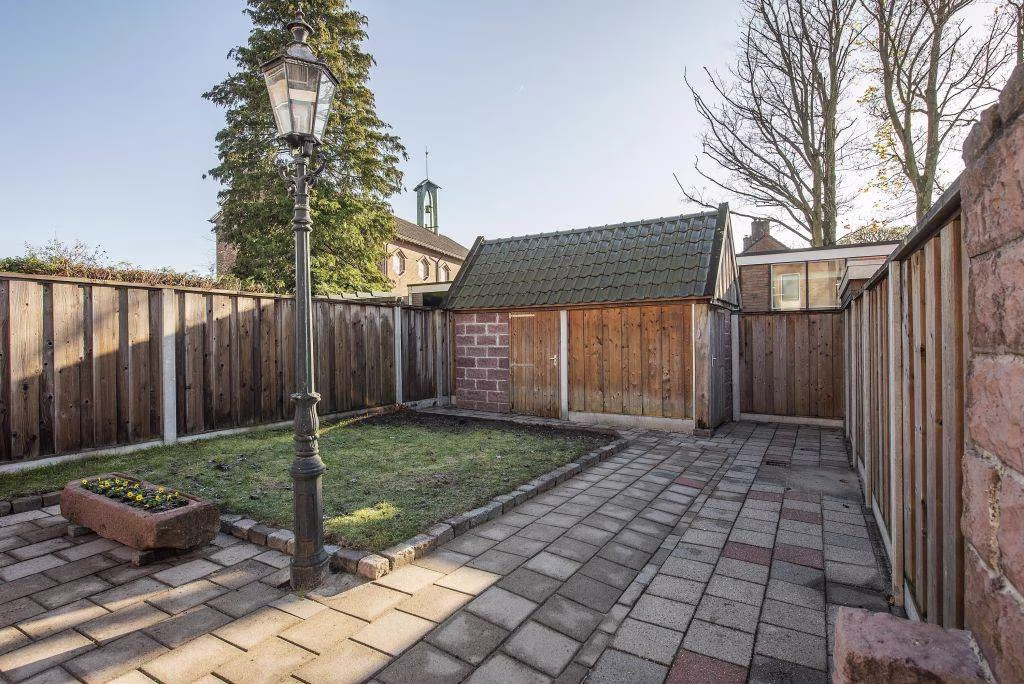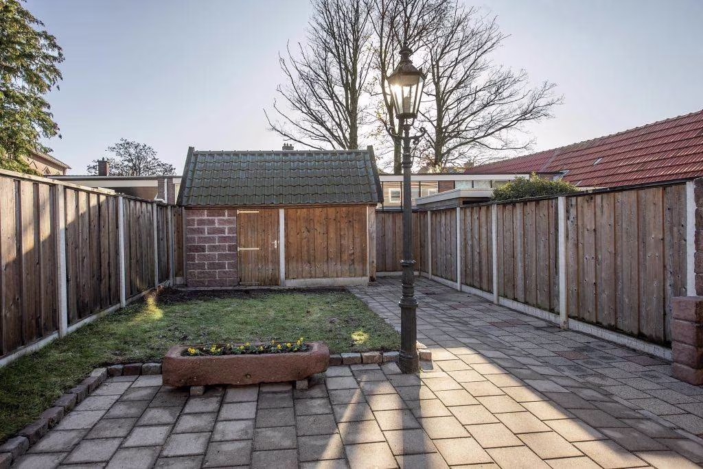 De tuin van deze woning straalt direct een nostalgische charme uit, alsof je even teruggaat in de tijd. De klassieke lantaarnpaal, de stenen bloembak en de houten berging achterin geven de tuin karakter en sfeer. De combinatie van een tegelterras en een grasperk maakt het geheel ruimtelijk en is onderhoudsvriendelijk. Er is voldoende plek voor een tuintafel of een comfortabele loungeset. Achterin de tuin bevindt zich de handige berging voor het opbergen van seizoensartikelen, tuingereedschap en andere benodigdheden, waardoor de tuin overzichtelijk en netjes blijft.