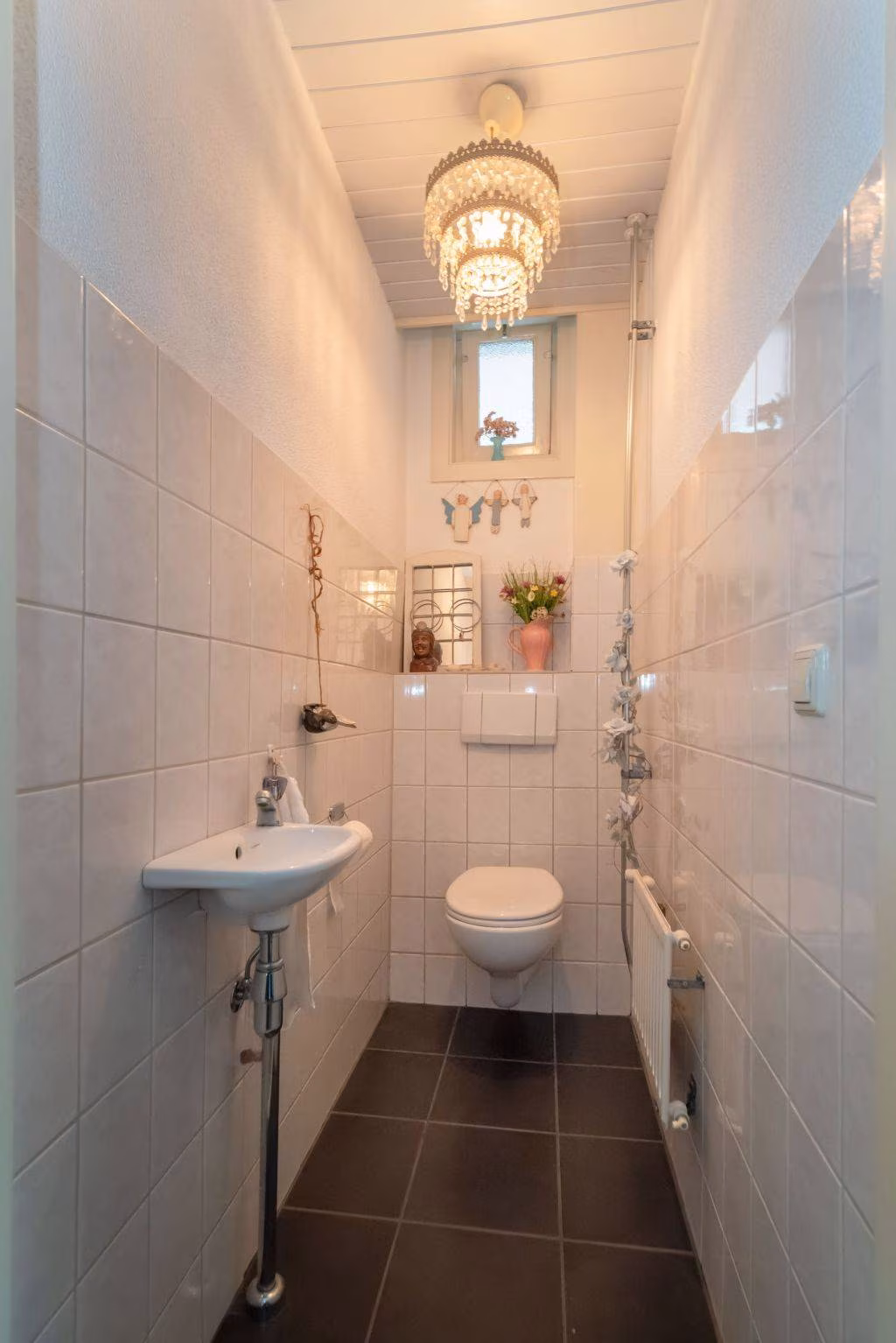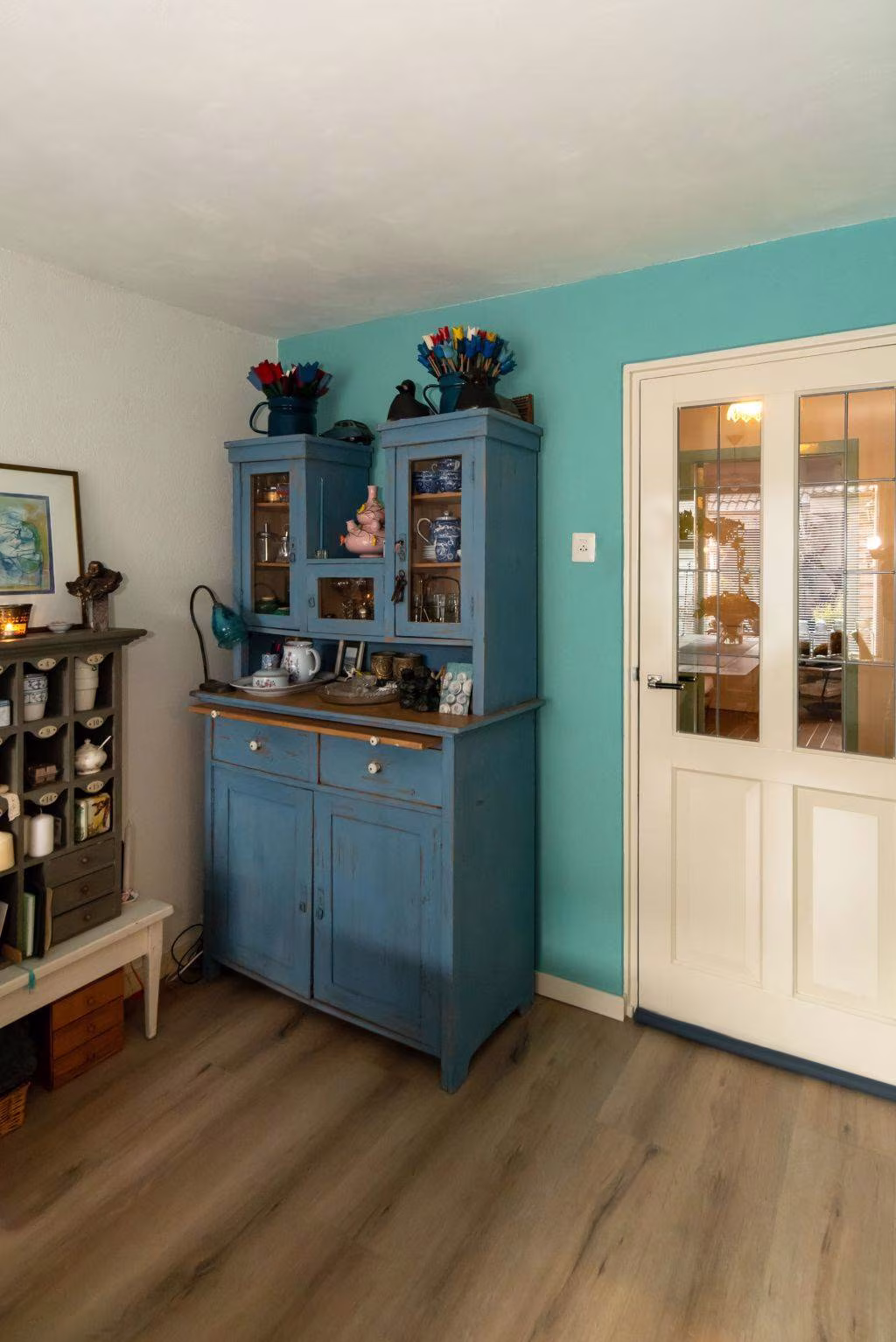 De woonkeuken is praktisch ingericht met een keuken in hoekopstelling, voorzien van diverse inbouwapparatuur. Aangrenzend ligt de bijkeuken met vaste kastruimte, wasmachineaansluiting en de CV-opstelling (2024). Via de achterdeur loop je zo de tuin in.