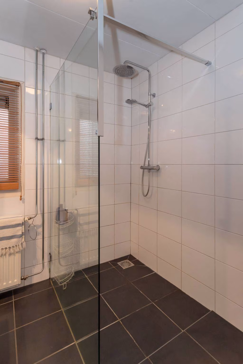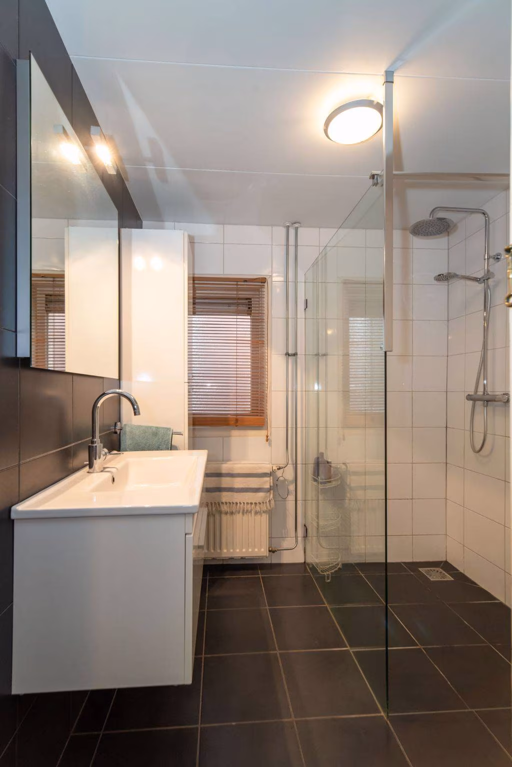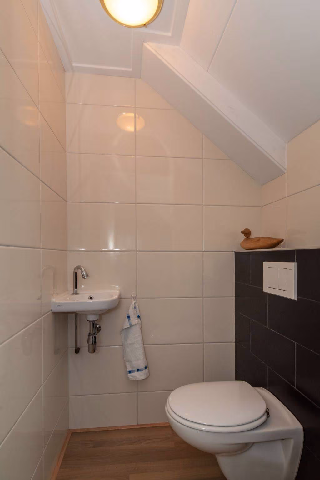 De badkamer beschikt over een inloopdouche en een wastafelmeubel. Het toilet is separaat en voorzien van een hangtoilet en fontein.
