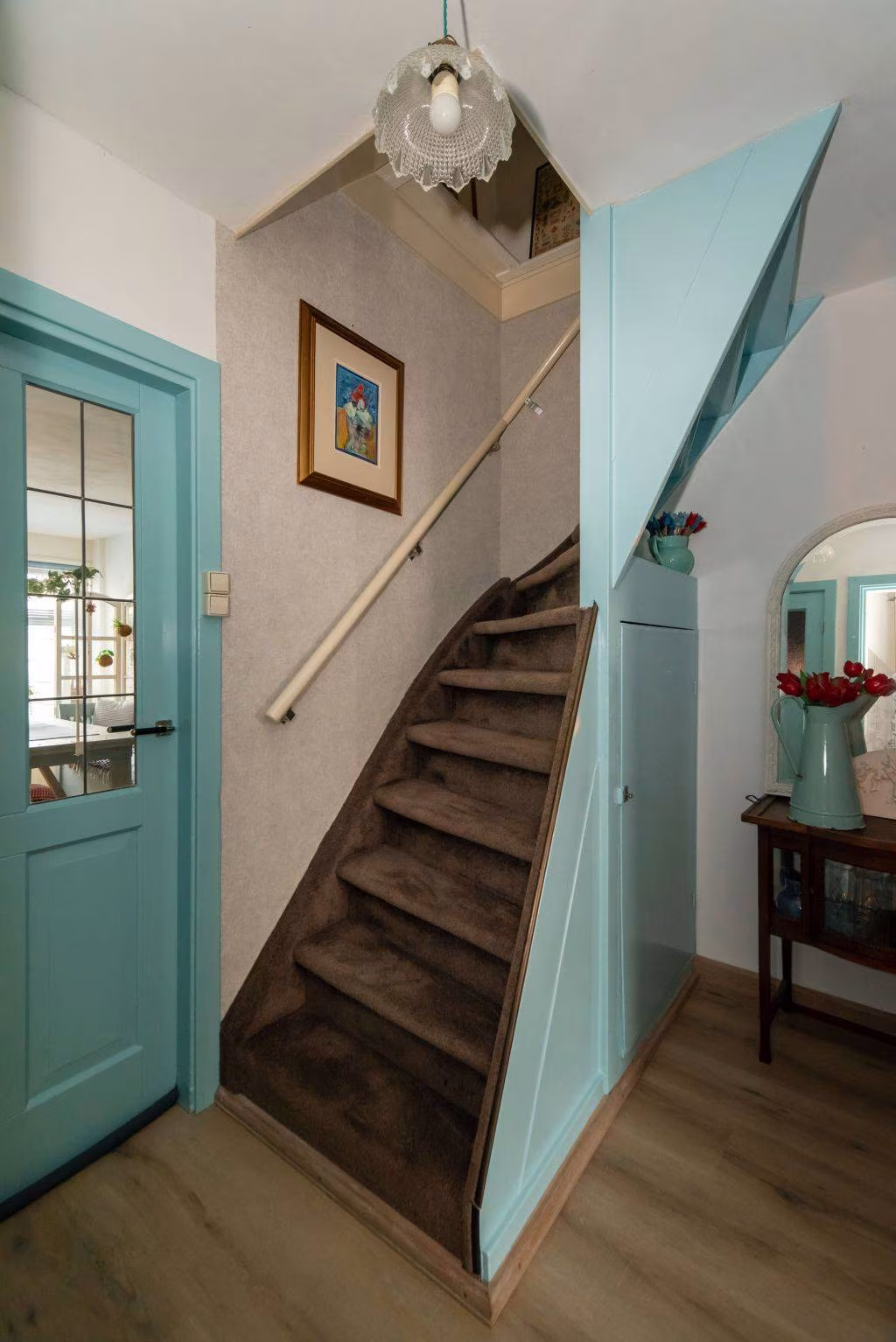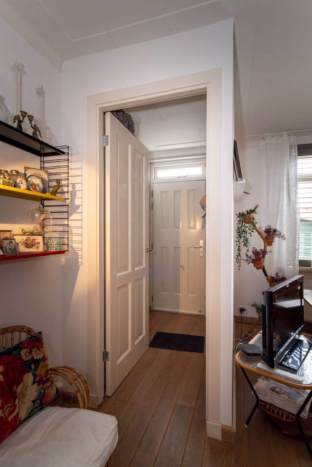 Via de voordeur komen we uit in de hal met meterkast. Vanuit hier bereik je de woonkamer: een fijne, rechthoekige ruimte met een mooie parketvloer en veel lichtinval. De woonkamer sluit aan op de tussenhal, vanwaar je toegang hebt tot de woonkeuken, het toilet, de badkamer én de trap naar boven.