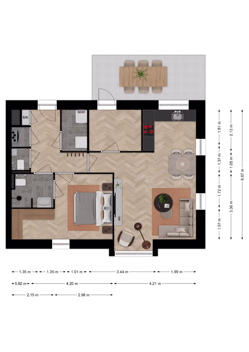 Indeling: appartement op de begane grond: entree/hal, meterkast, toilet met fontein, technische ruimte, bijkeuken met wasmachine aansluiting, slaapkamer L-vorm met ruimte tbv inloopkast annex badkamer, woonkamer met open keuken, (2de slaap) hobbykamer welke grenst aan het naastgelegen terras, waarbij het ook erg mooi is om deze ruimte bij de woonkamer te betrekken.