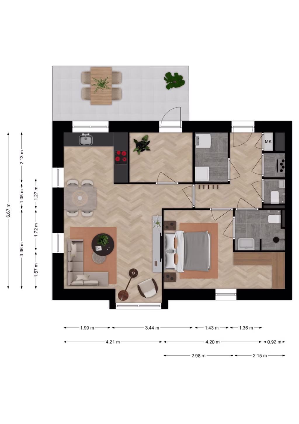 Indeling appartement op de begane grond: entree/hal, meterkast, toilet met fontein, technische ruimte, bijkeuken met wasmachine aansluiting, slaapkamer L-vorm met ruimte tbv inloopkast annex badkamer, woonkamer met open keuken, (2de slaap) hobbykamer welke grenst aan het naastgelegen terras, waarbij het ook erg mooi is om deze ruimte bij de woonkamer te betrekken.