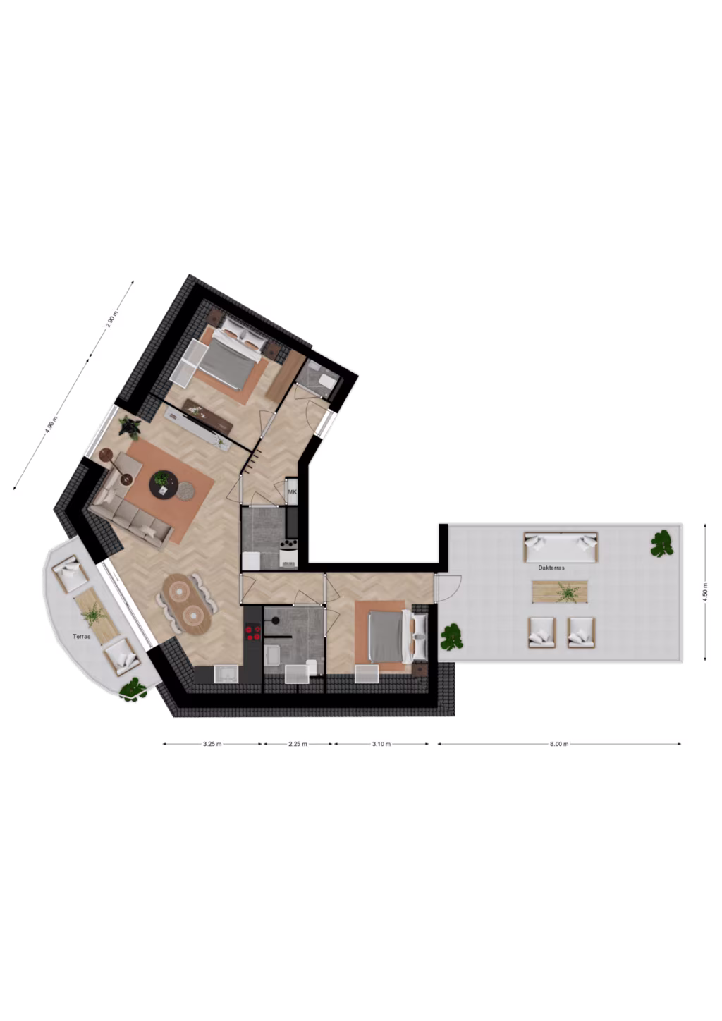 * dakterras 36 m²;