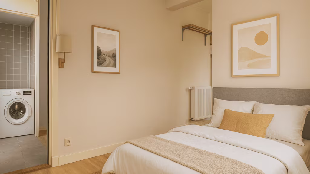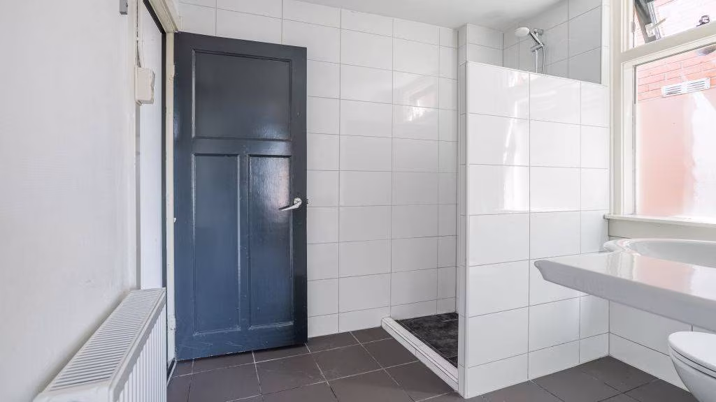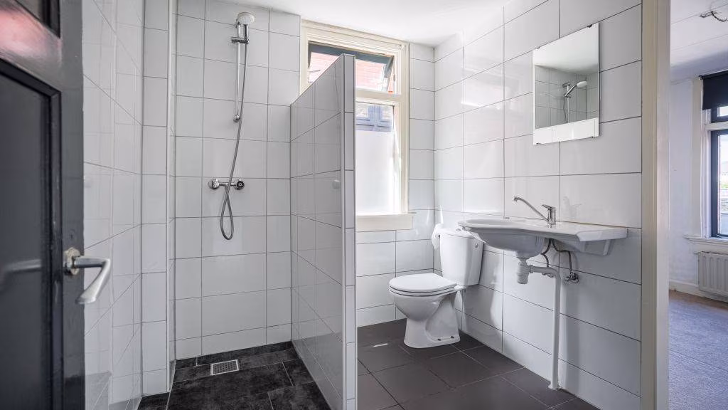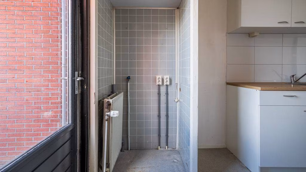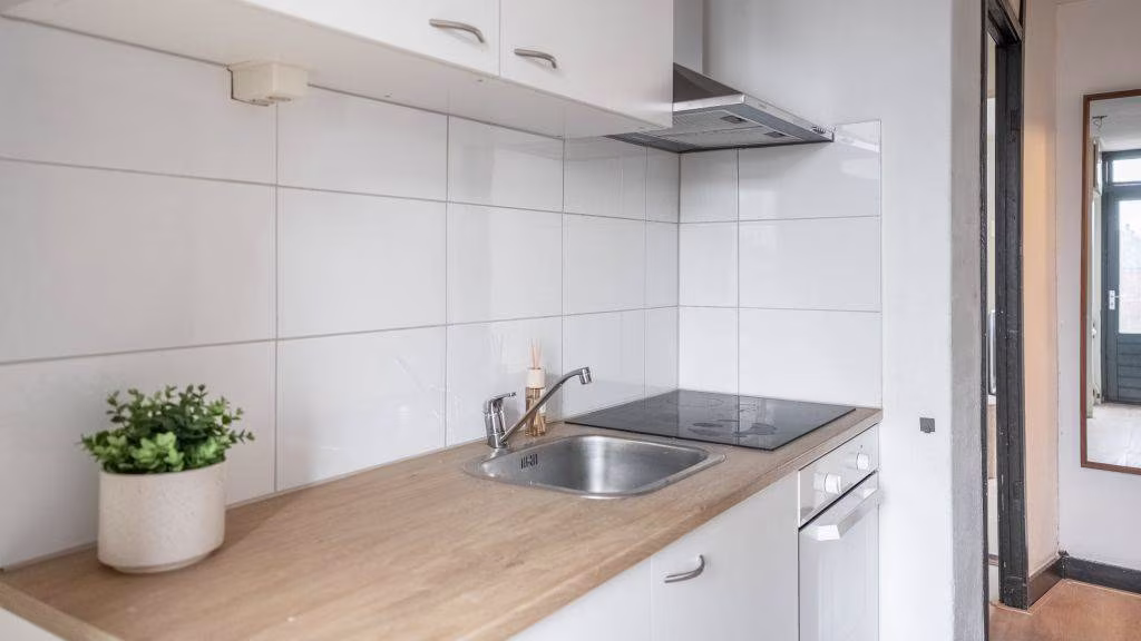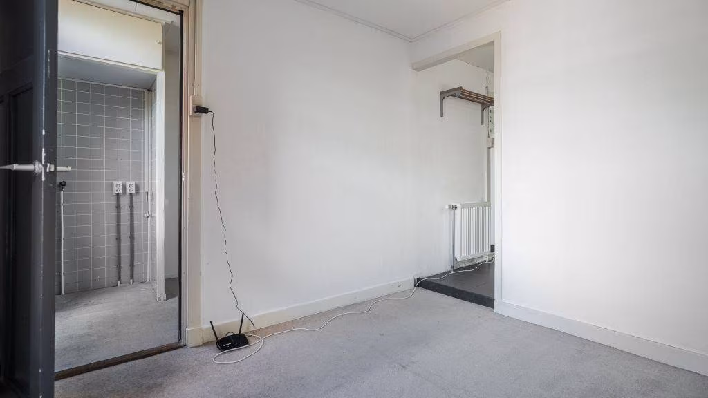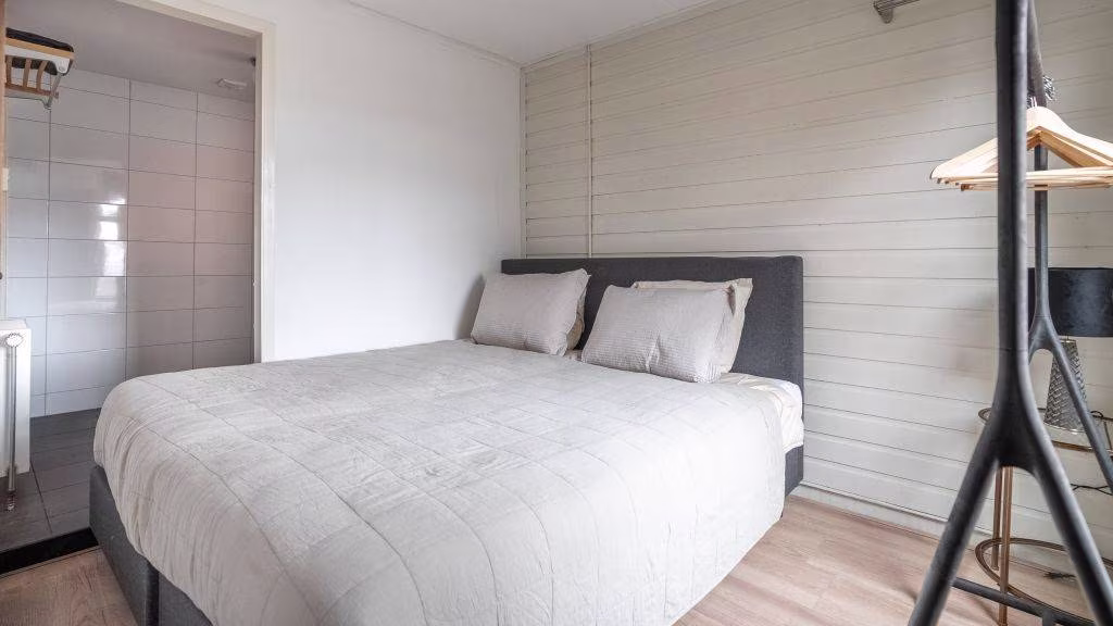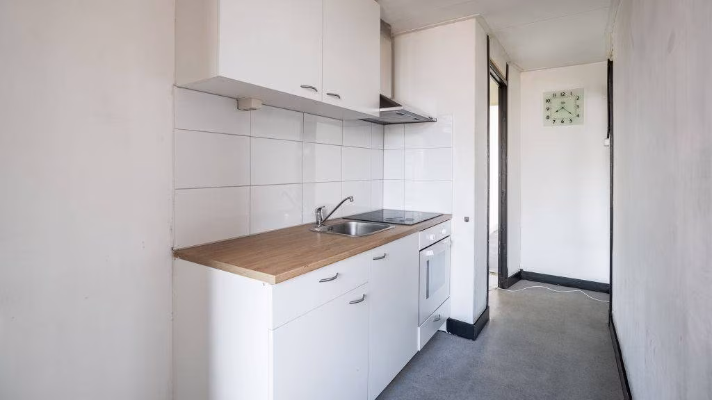 Entree, hal, slaapkamer met badkamer en-suite en voorzien van douche, toilet en wastafel. Keuken met inductiekookplaat en hal voor aansluiting witgoed apparatuur.