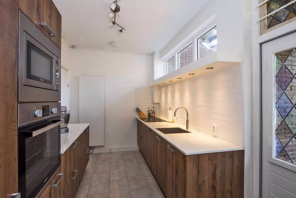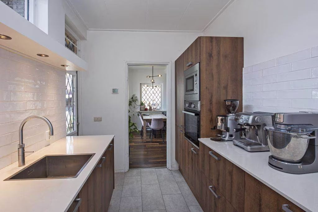 - Dichte keuken (± 9 m²) met keukenblok (2019) in parallel-opstelling, v.v. "Bora"-kookplaat met geïntegreerde, recirculerende afzuiging, vaatwasser, combi-magnetron, oven, koel-vriescombinatie en "Quooker";