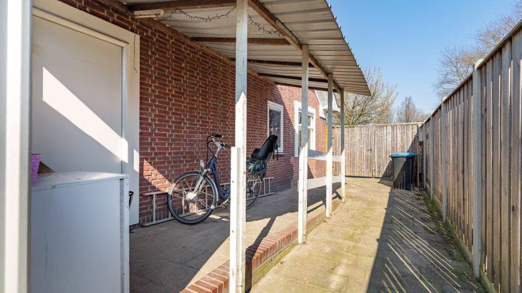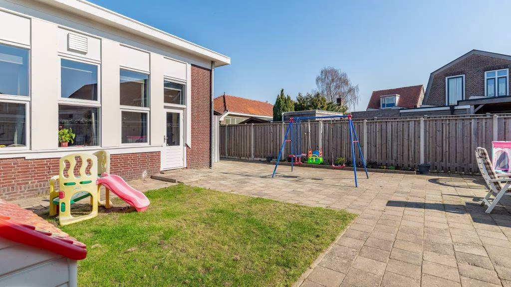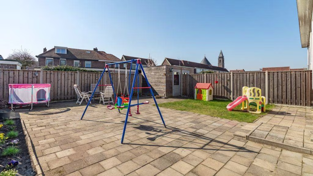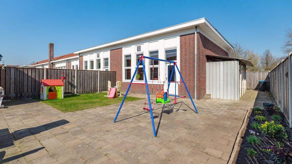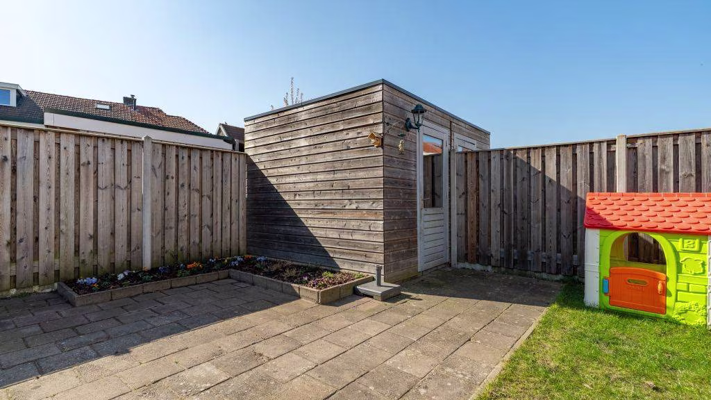De achtertuin is gelegen op het zonnige zuiden en beschikt over een achterom én praktische berging, voorzien van elektra.