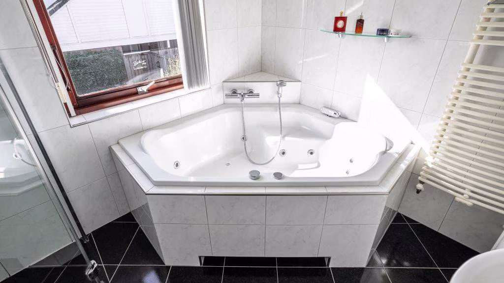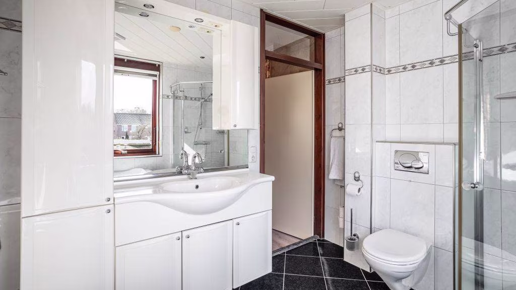 Overloop met toegang tot drie ruime slaapkamers en een nette badkamer. De badkamer is compleet ingericht met een douchecabine, wastafelmeubel, tweede toilet en een heerlijk hoekligbad.