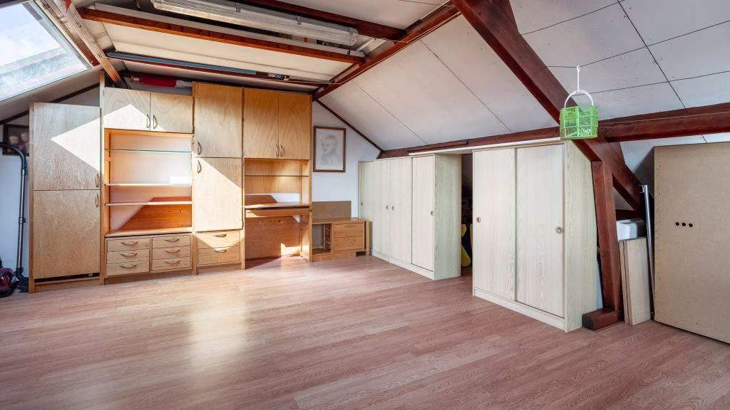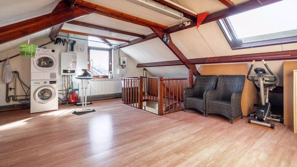 Via een vaste trap bereik je de ruime zolderverdieping. Hier bevinden zich de witgoedaansluitingen en de opstelplaats voor de cv-ketel. Dankzij het aanwezige dakraam leent deze ruimte zich uitstekend voor het creëren van een volwaardige vierde slaapkamer.