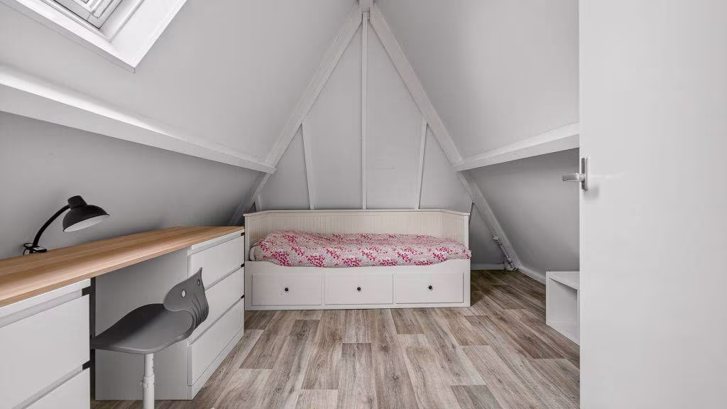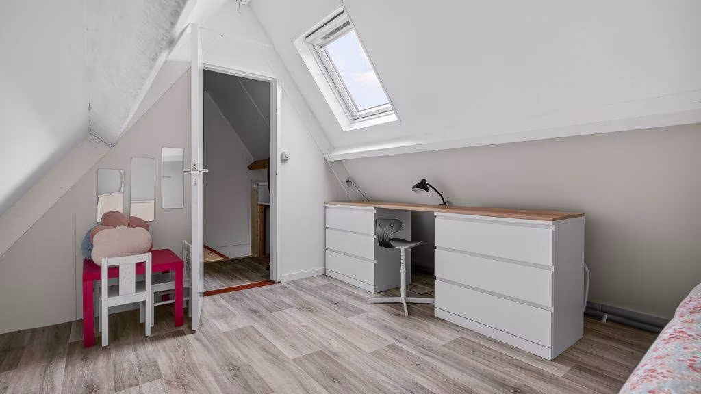 Middels vaste trap naar voorzolder met voldoende bergruimte en opstelplaats cv ketel en een doorloop naar een ruime zolderkamer met dakvenster.