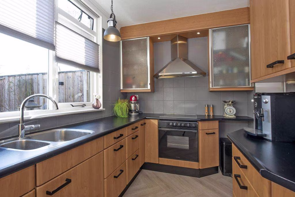 De woonkamer, voorzien van een strakke visgraat vloer met gedeeltelijk vloerverwarming, is een prettige leefruimte met een uitbouw aan de voorzijde en zicht op de rustige straat. Je hebt hier genoeg plek voor een ruime zithoek en een royale eettafel. Door de open verbinding met de keuken loopt de ruimte prettig in elkaar over. De keuken heeft een nette afwerking en is voorzien van inbouwapparatuur. Vanuit de keuken kan je, via een halletje, direct de tuin bereiken.