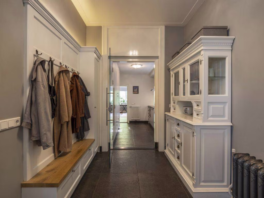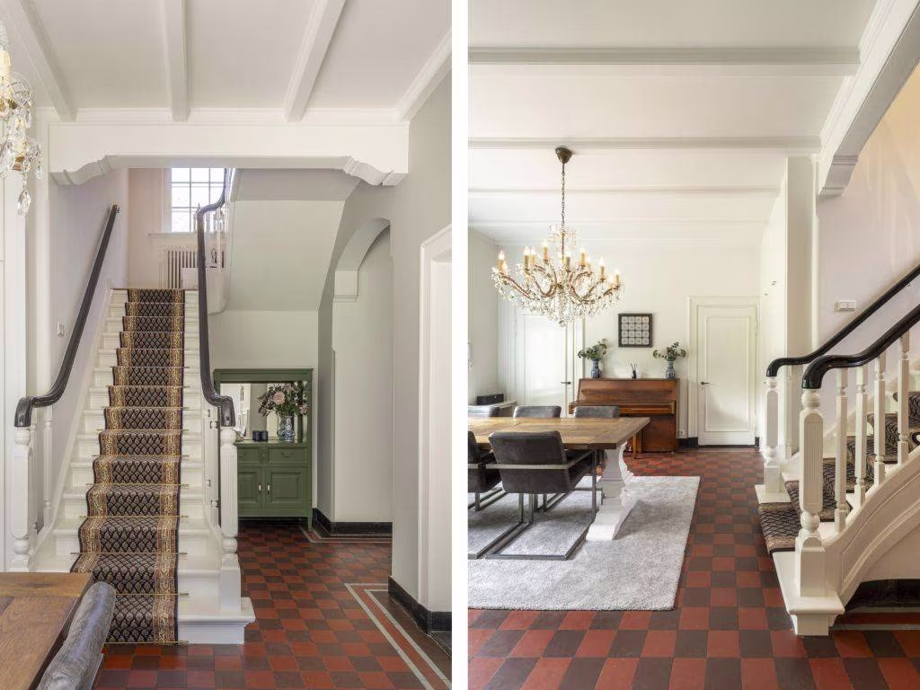 Een portiek herbergt de voordeur. Daarachter een gang die de authentieke sfeer ademt. Op de vloer nog de originele tegels, dambordmotief rood/zwart met een lichtgrijze bies en zwarte opstaande rand. De toiletruimte is ruim en heeft een hangtoilet én urinoir en een wit meubel met antracietkleurig blad waarin het wasbekken is geïntegreerd. De gang komt uit in de monumentale hal. Een hal met allure, dankzij de (hiervoor beschreven) originele tegelvloer en trappenhuis. Op de witgelakte trap met sierlijke leuning ligt een traploper met messing roeden. De grote raampartij in de voorgevel laat aangenaam veel daglicht binnen. Verder is er een schouw met houthaard die al brandt sedert 1908. De hal, ingericht als eetkamer, geeft toegang tot de living en tot de keuken.