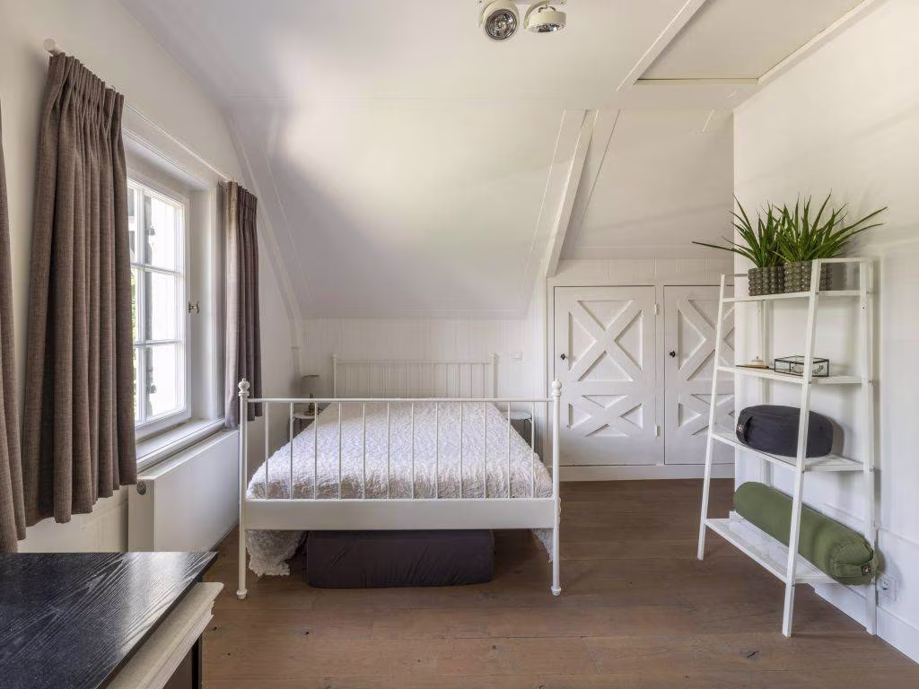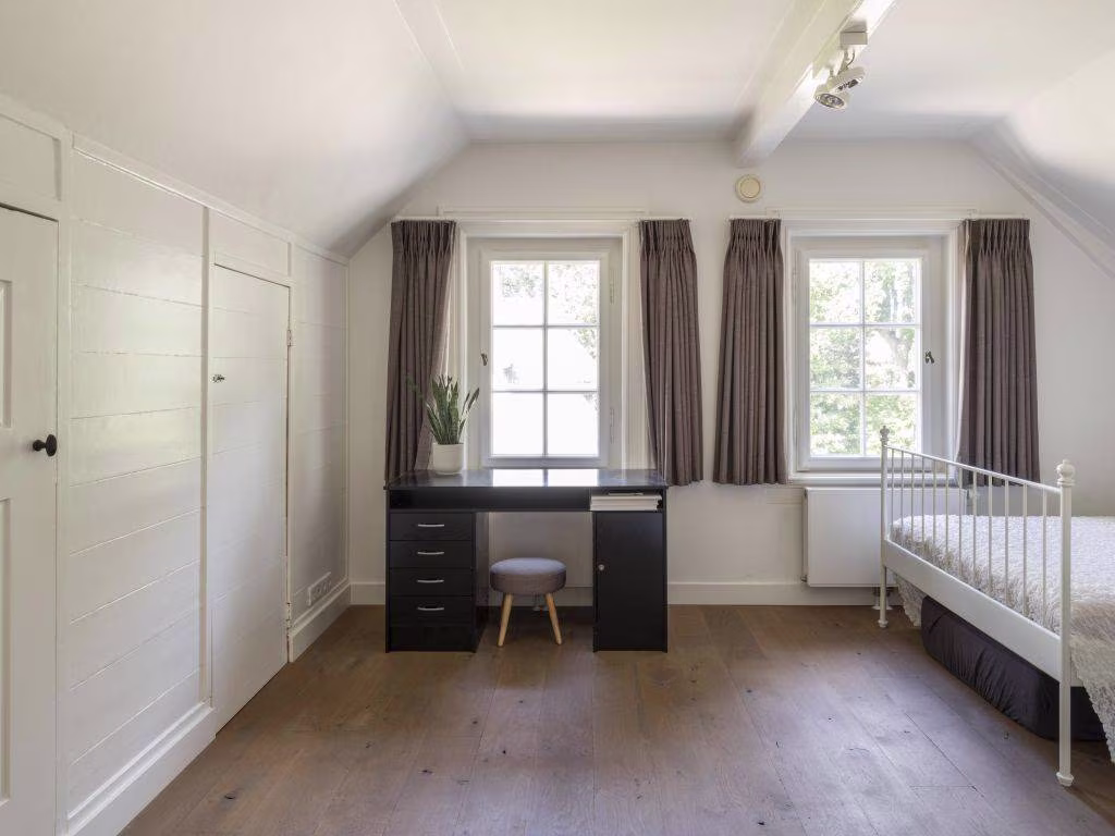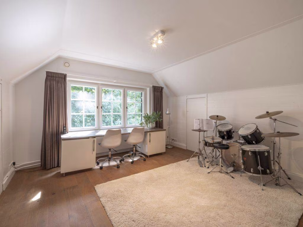 Op de hoogste verdieping, een eeuw geleden het domein van het personeel, kom je via een witgelakte trap, belegd met een loper. Twee dakkapellen zorgen voor extra daglicht en ruimte. Op de overloop en in de twee ruime slaapkamers zien we weer een fraaie eiken vloer. De strak-moderne badkamer (vloerverwarming) is uitgerust met een ruime douche, een breed meubel (zwarte hoogglans) met twee waskommen, een hangtoilet en een urinoir. De vloertegels in terrazzolook maken het plaatje compleet.