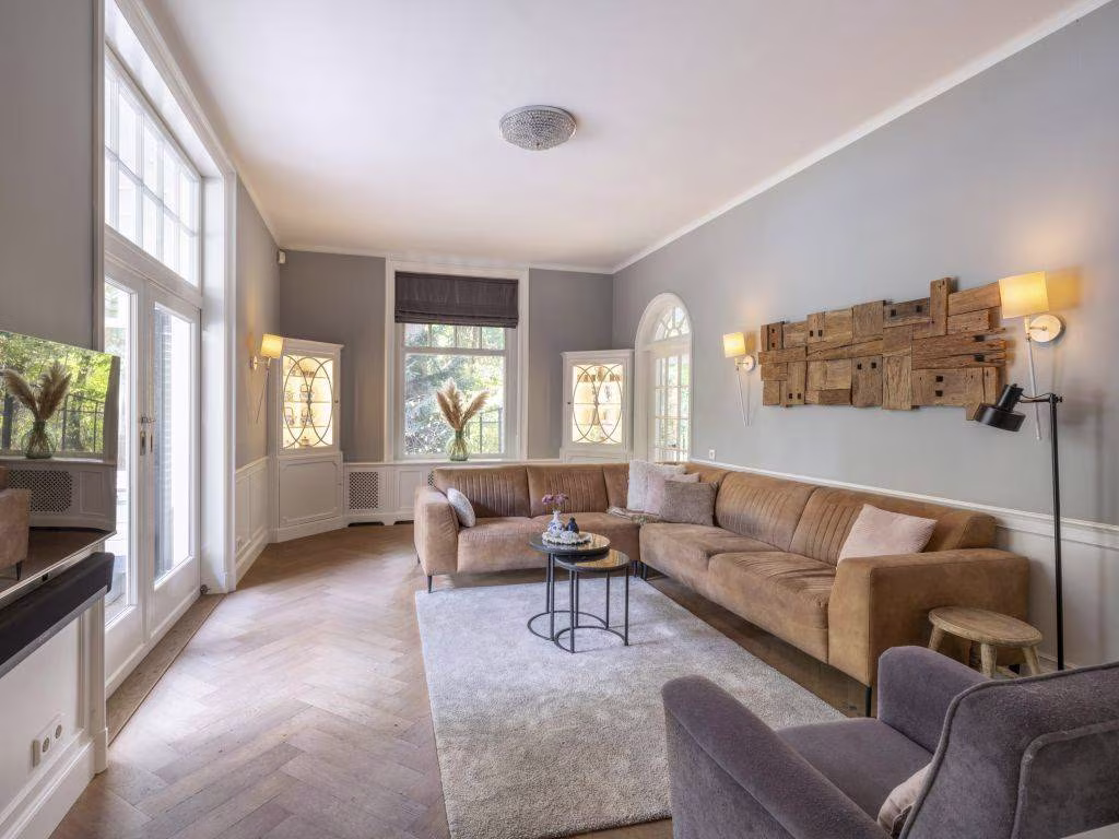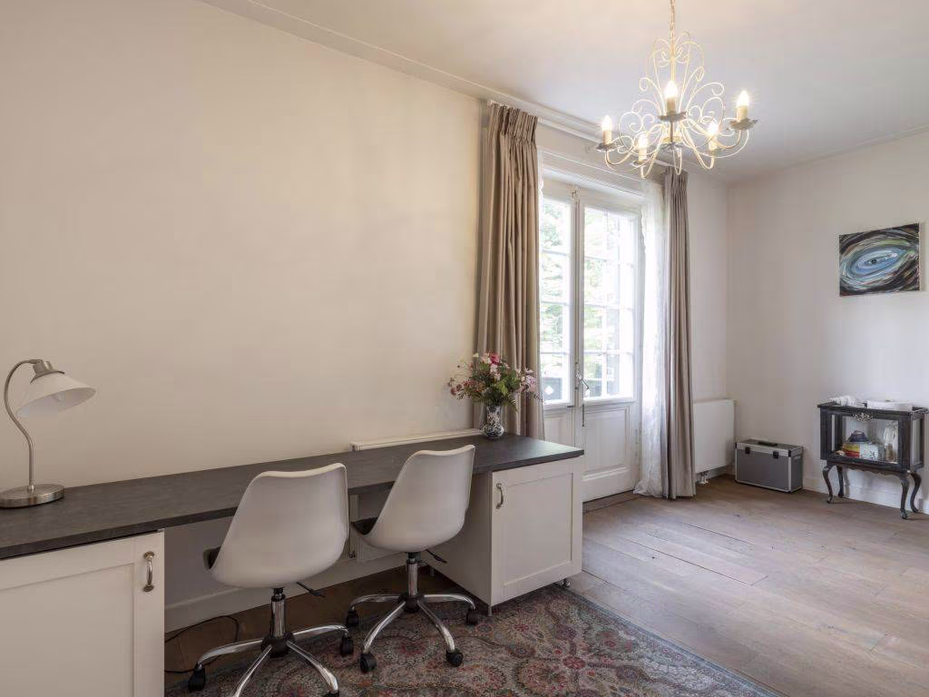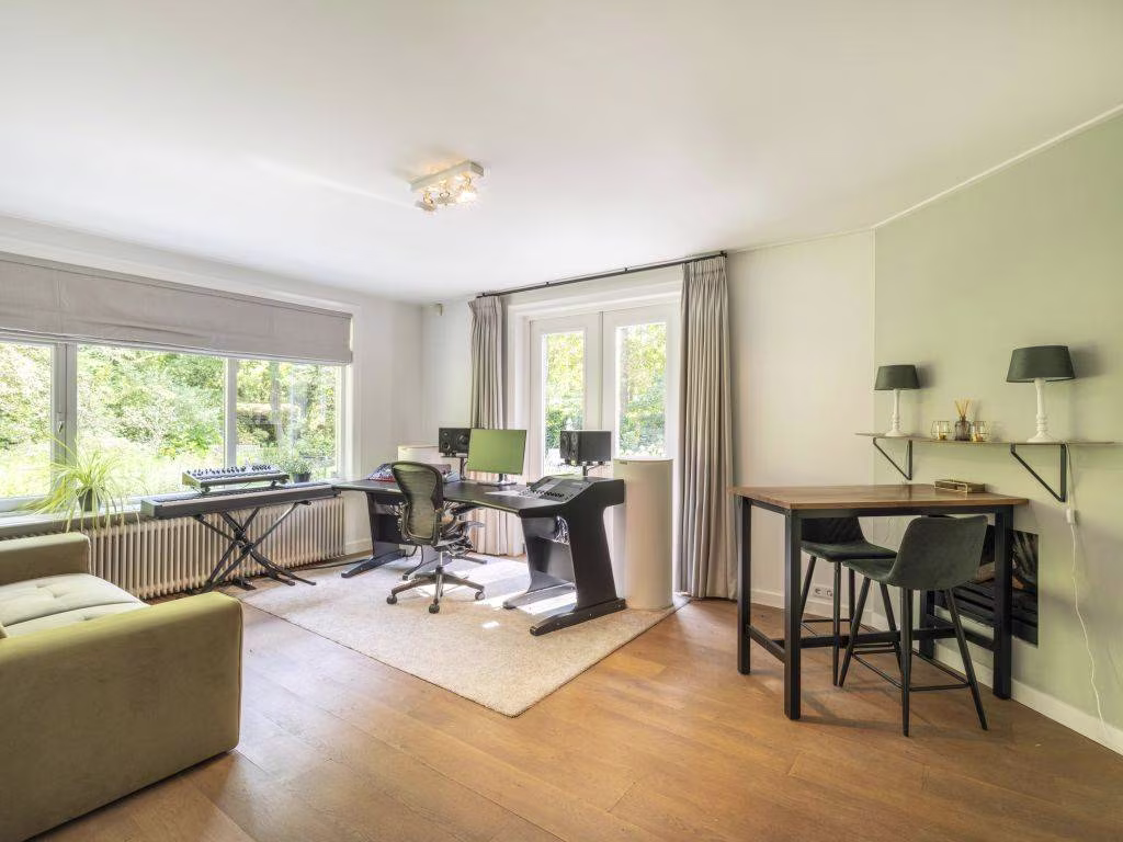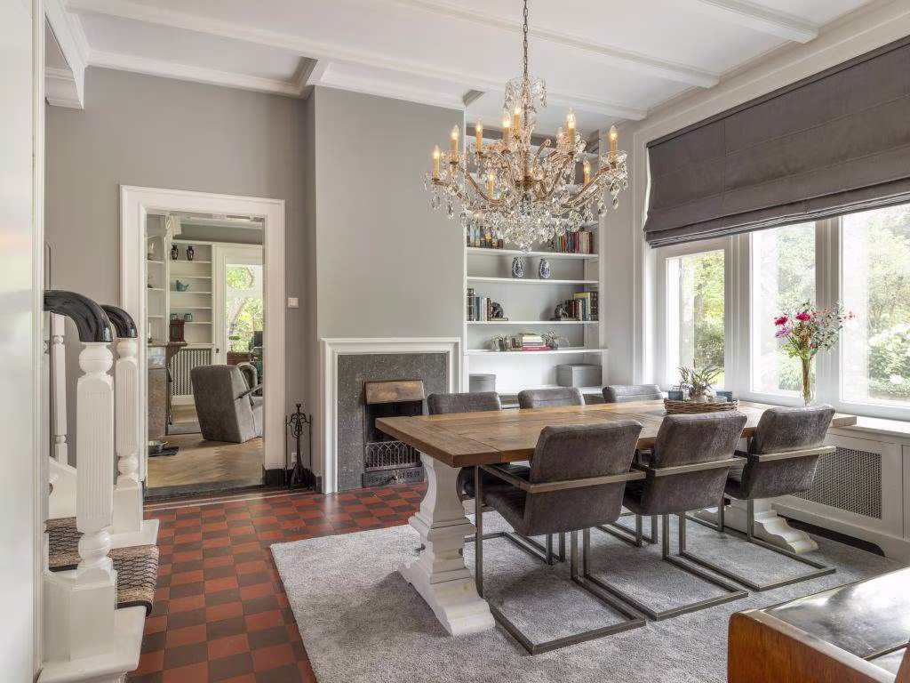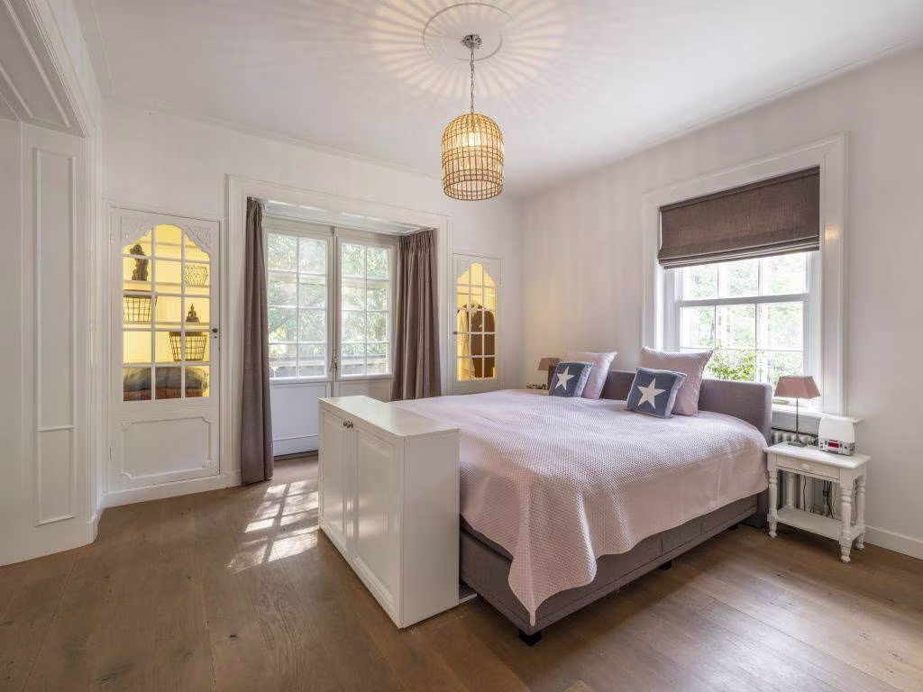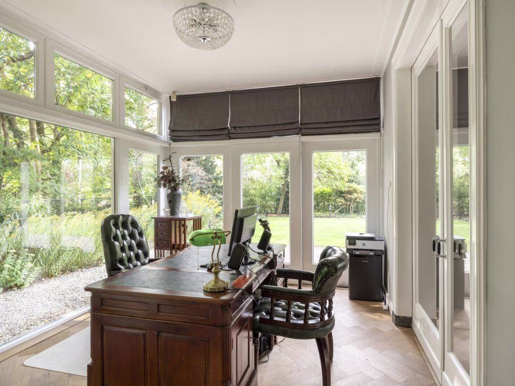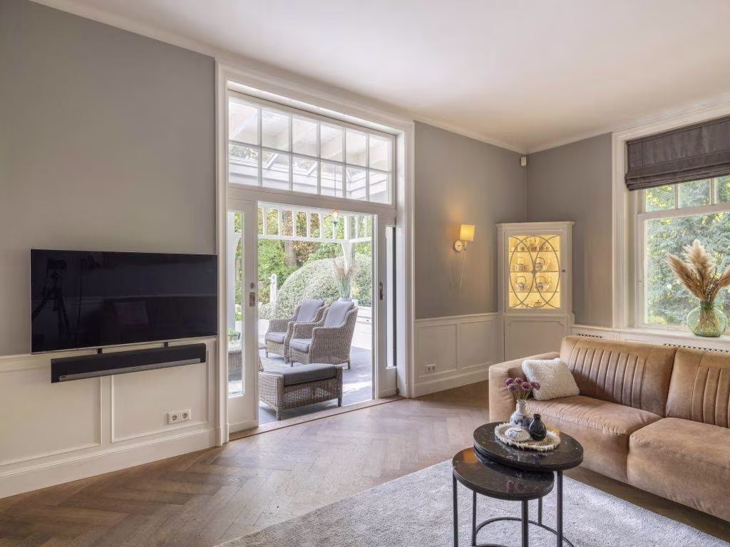 Ook hier weer de warme eikenhouten vloer in visgraatmotief. Deze voormalige eetkamer bevindt zich vlakbij de keuken. We zien hier twee vaste vitrinekasten en een houten lambrisering. Dubbele schuifdeuren verbinden de kamer met de tuin en geven tevens toegang tot de veranda.