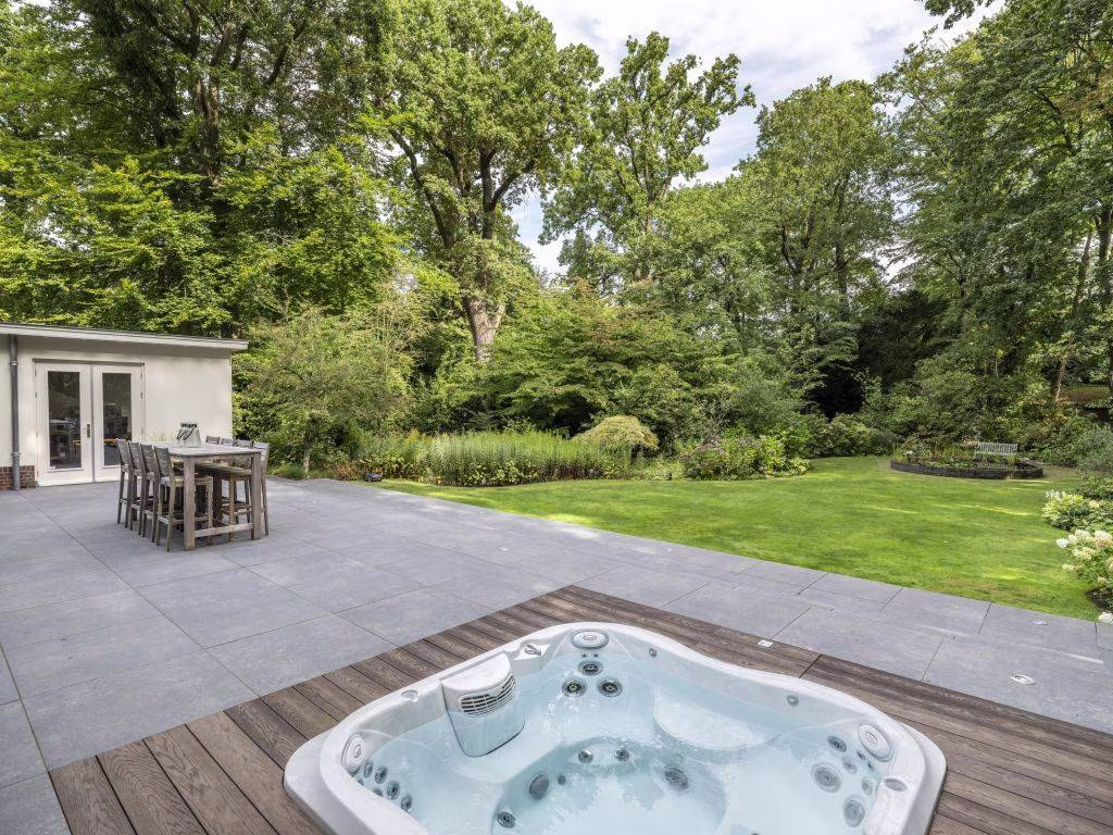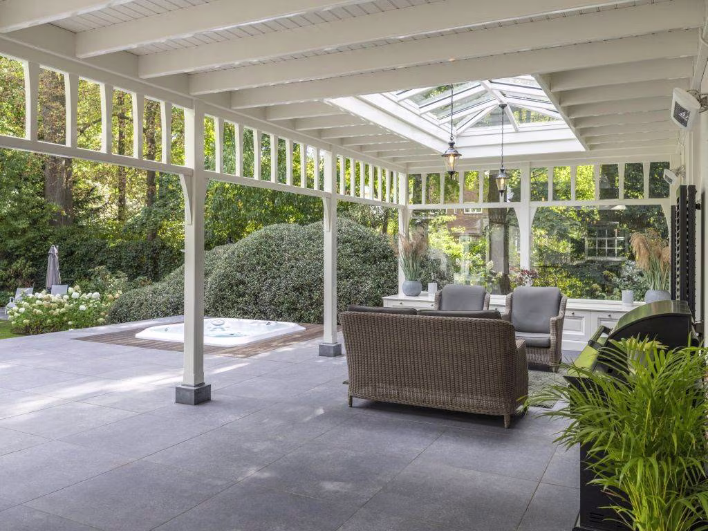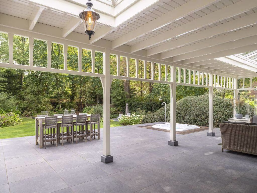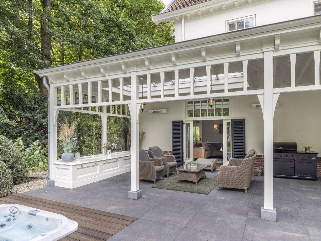 In 2020 is de villa uitgebouwd met een schitterende houten veranda, die zich uitstrekt over de volle lengte van de achtergevel. Hiervoor heeft de authentieke portiek van de hoofdentree model gestaan. Meesterlijk vakwerk van de interieurbouwer die met traditionele verbindingen alle onderdelen van de ambachtelijke houten constructie met elkaar verbond. De veranda heeft twee lichtstraten en een viertal infrarood heaters. Ter beschutting is de open zijkant voorzien van glas. De vloer bestaat uit grijze keramische tegels die doorlopen op het aangrenzende open terras. Hier zien we een (verzonken) jacuzzi, met een buitendouche. Wat een uitzicht heb je hier over de tuin die vier traptreden lager is gelegen.