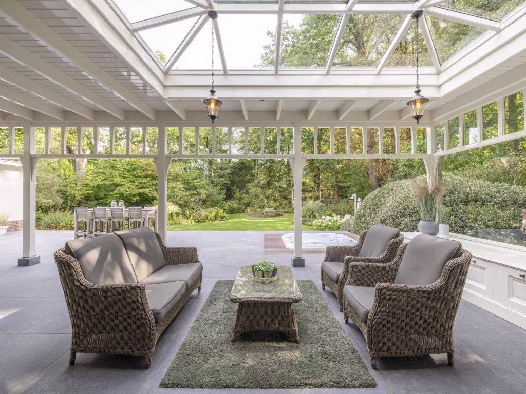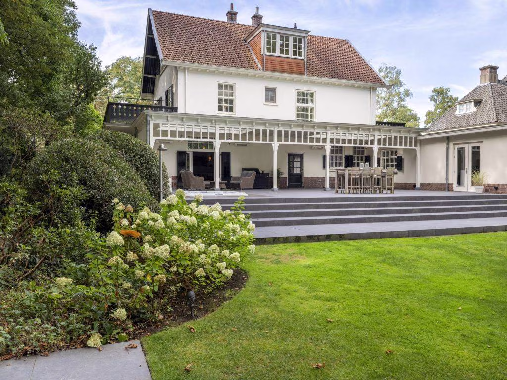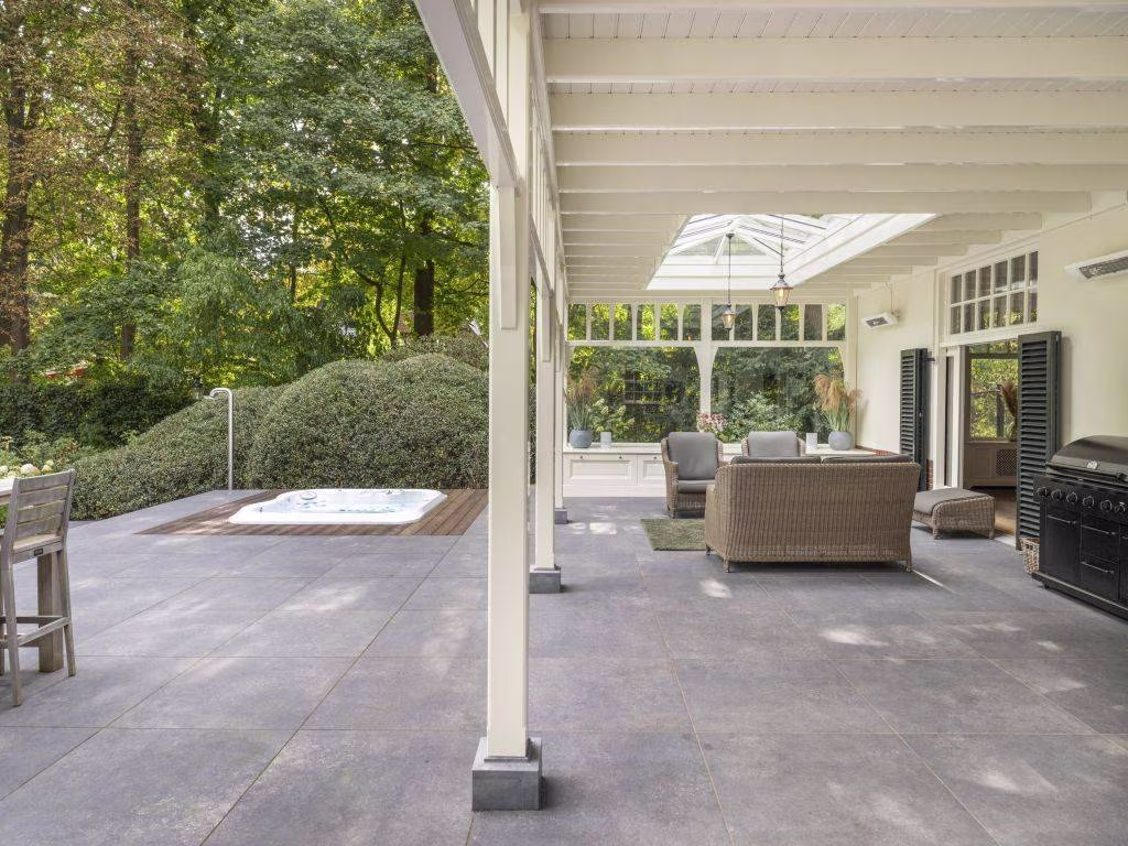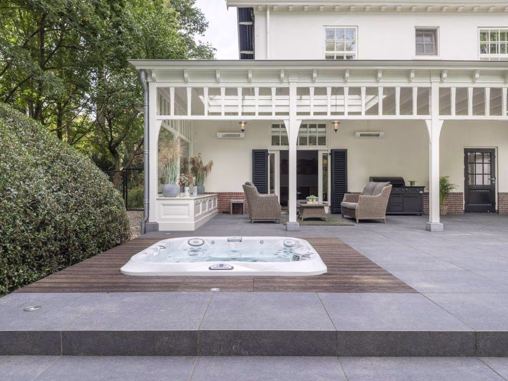 In 2020 is de villa uitgebouwd met een schitterende houten veranda, die zich uitstrekt over de volle lengte van de achtergevel. Hiervoor heeft de authentieke portiek van de hoofdentree model gestaan. Meesterlijk vakwerk van de interieurbouwer die met traditionele verbindingen alle onderdelen van de ambachtelijke houten constructie met elkaar verbond. De veranda heeft twee lichtstraten en een viertal infrarood heaters. Ter beschutting is de open zijkant voorzien van glas. De vloer bestaat uit grijze keramische tegels die doorlopen op het aangrenzende open terras. Hier zien we een (verzonken) jacuzzi, met een buitendouche. Wat een uitzicht heb je hier over de tuin die vier traptreden lager is gelegen.