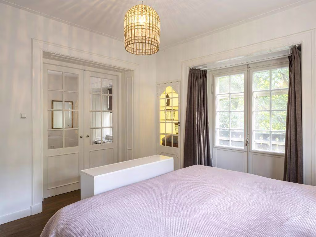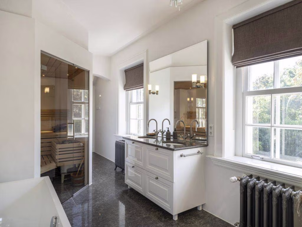 De stijlvolle trap vanuit de eerder genoemde hal (nu eetkamer) wordt onderbroken door een bordes. Vanaf hier is de trap bekleed met eikenhout. En met hetzelfde eiken zijn de overloop, beide slaapvertrekken en de kleedruimte belegd. Naast deze en-suite kleedruimte, met vaste kastenwand, beschikt de royale ouderslaapkamer over een luxe privébadkamer met vloerverwarming. Deze is uitgerust met een vrijstaand ligbad, een ruime 2-persoons inloopdouche met glaswanden, een dubbele wastafel met meubel en een Finse sauna. De twee originele, gedecoreerde cv-radiatoren hebben hier (terecht) een plek gekregen. De wanden zijn afgewerkt met grijswit beton cire, de vloer met composiettegels. Het tweede ruime slaapvertrek heeft, net als de ouderkamer, een eigen balkon. Handig is de extra badkamer met vloerverwarming op deze etage, uitgevoerd in tijdloos wit (wanden) en antraciet (vloer). Deze heeft een inloopdouche,een wastafel en een toilet.