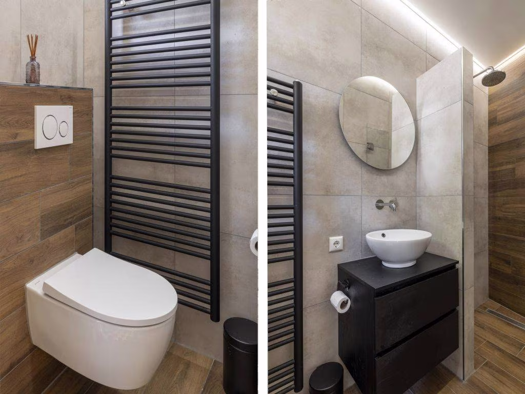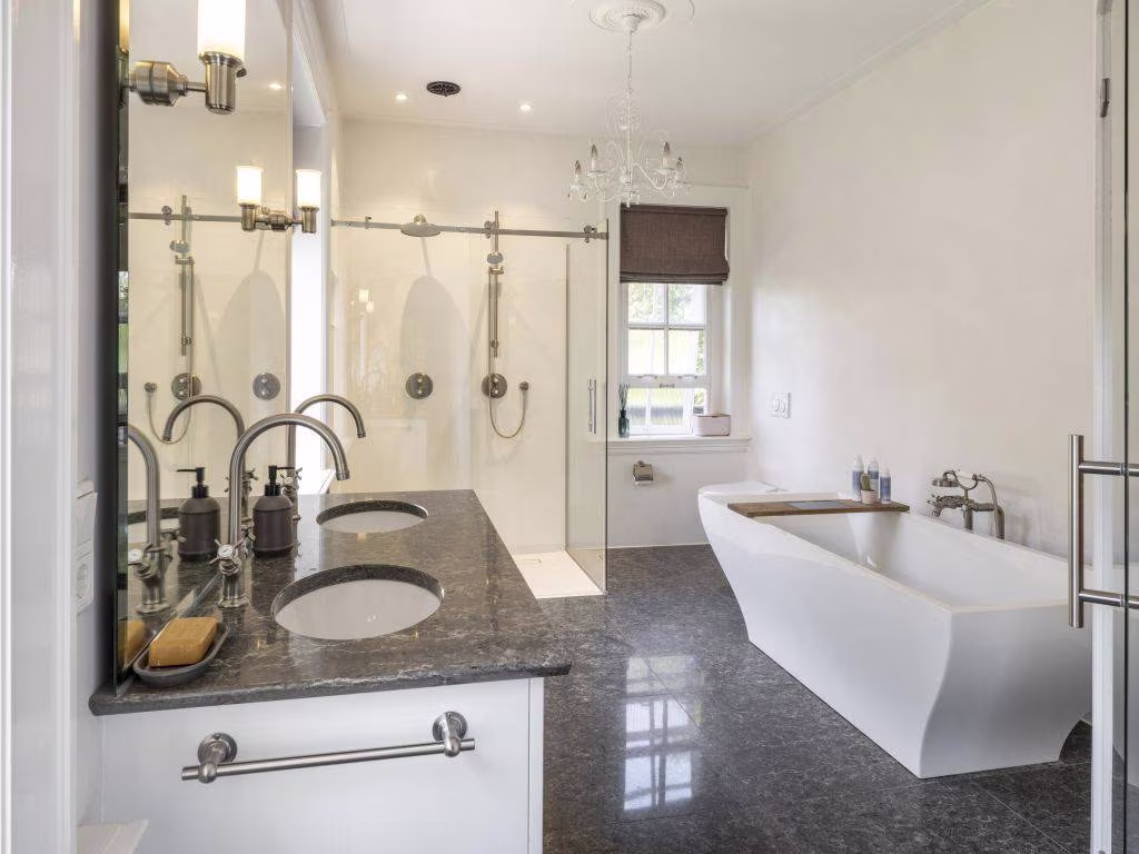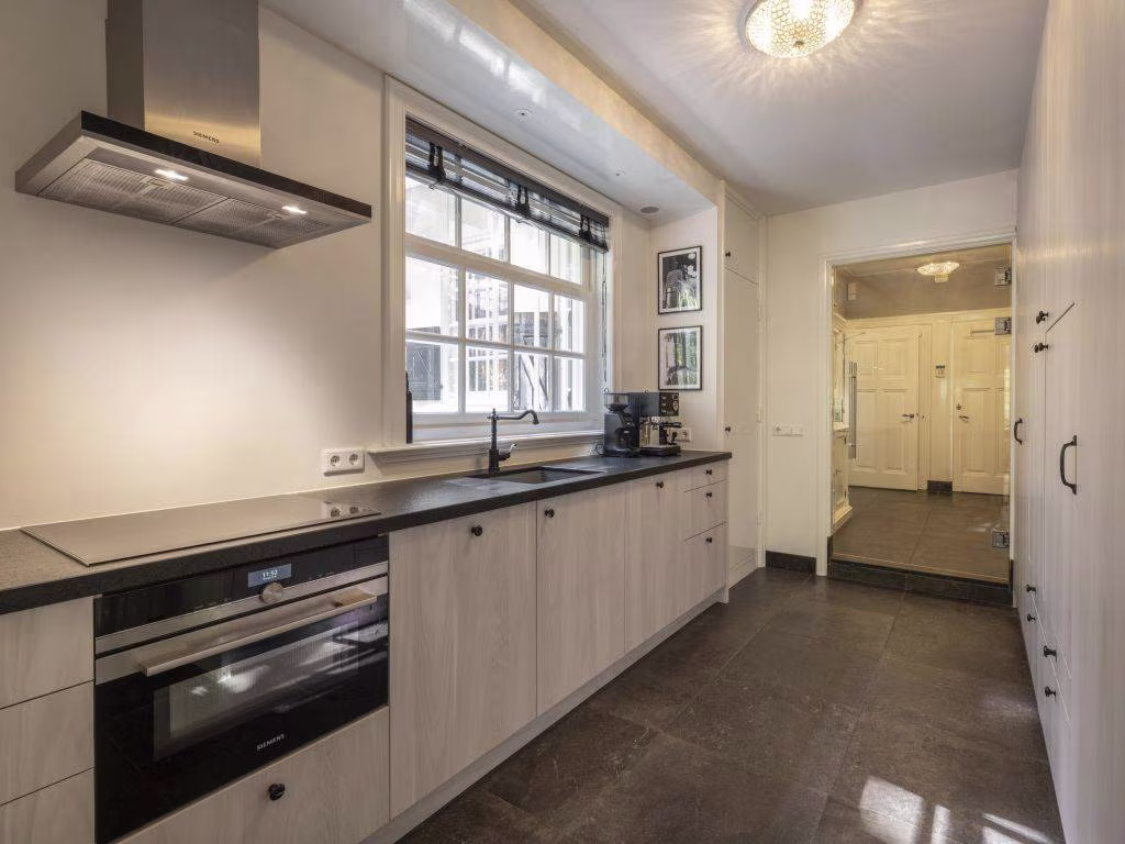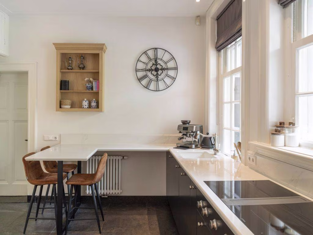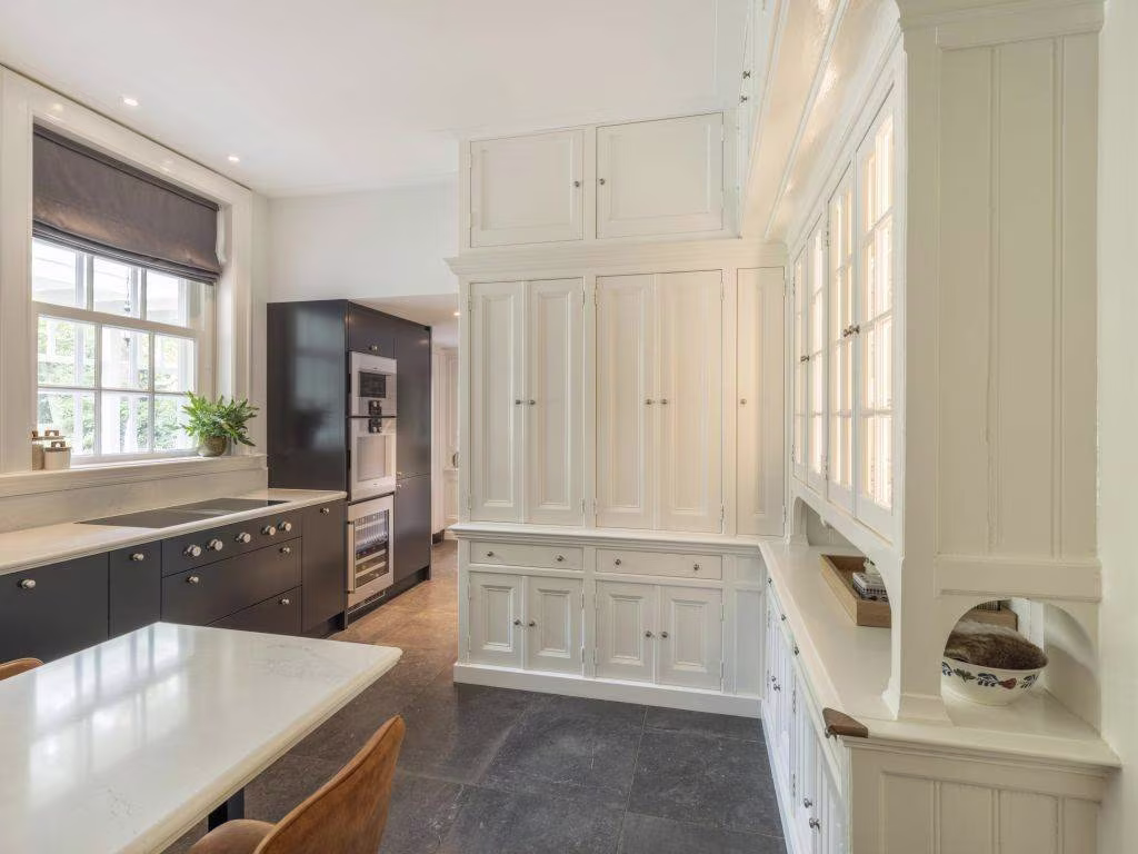 In de keuken zijn strak-modern en klassiek-landelijk met elkaar verweven tot een smaakvol geheel. Perfect aansluitend op de authentieke buffetkast is de op maat gemaakte kastenwand (offwhite). De matte ‘warmzwarte’ fronten van de strakke keuken combineren fraai met het witte marmeren werkblad. In het bijpassende wandmeubel is de apparatuur ingebouwd, waaronder twee ovens en een wijnkast. De XL ‘vintage’ vloertegels, eveneens in een warme zwartbruine tint, maken het áf.