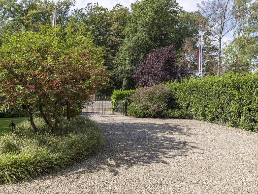 De villa ligt, gescheiden door een grote voortuin, op afstand van de Enschedesestraat. De royale oprit (grind op honingraatmatten) met op afstand bedienbare poort (smeedwerk) eindigt voor garage. Er is plek voor meerdere auto’s. De achtertuin kent verschillende loungeplekken. We zien een groot gazon, een (verhoogd aangelegde) vijver, borders met vaste planten, omzoomd door struiken, heesters en ten slotte bomen. Alsof je aan een bosrand woont. Astroklokken sturen de sfeerverlichting aan. Er is een opslagschuur voor tuinbenodigdheden.