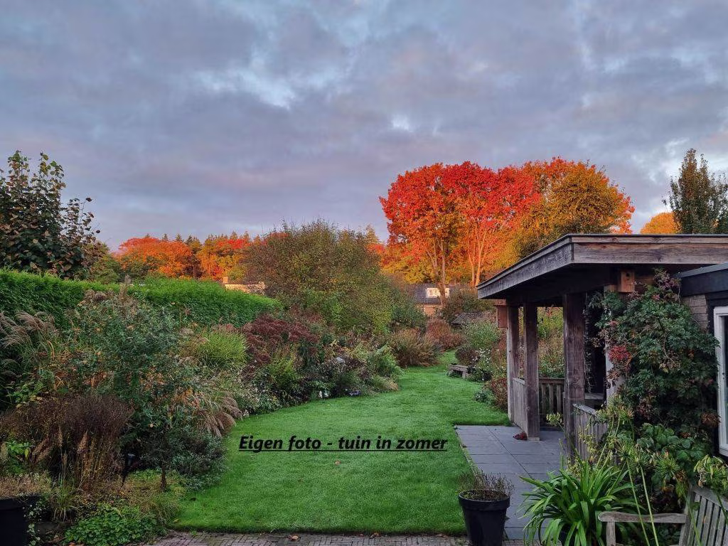 Met een kavel van bijna 1.300 m² geniet je hier van een zeer diepe en groene tuin op het westen, een overkapping, houten berging/bijenstal een vrijstaande garage. De royale oprit biedt ruimte aan meerdere auto’s en beschikt over een laadpaal.