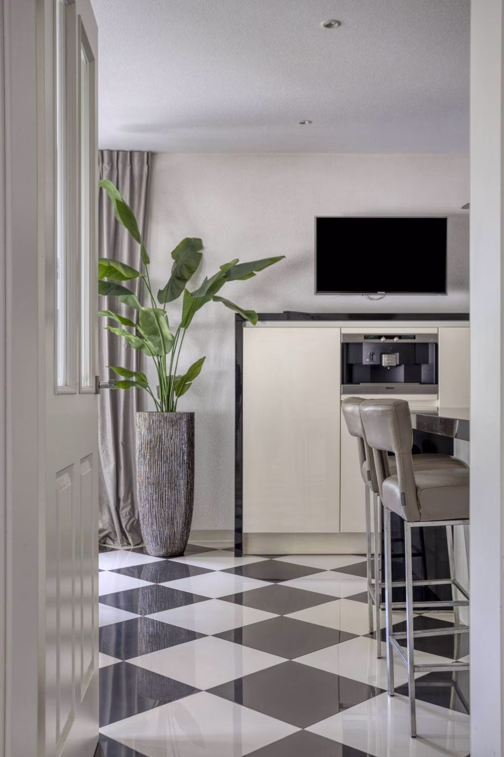 De moderne woonkeuken met bar is uitgerust met hoogwaardige inbouwapparatuur, waaronder een koelkast, vriezer, vaatwasser, Nespresso-apparaat, inductiekookplaat met afzuigkap, combimagnetron en een luxe waterfiltersysteem. Dankzij de royale indeling is er volop ruimte voor een grote eethoek.