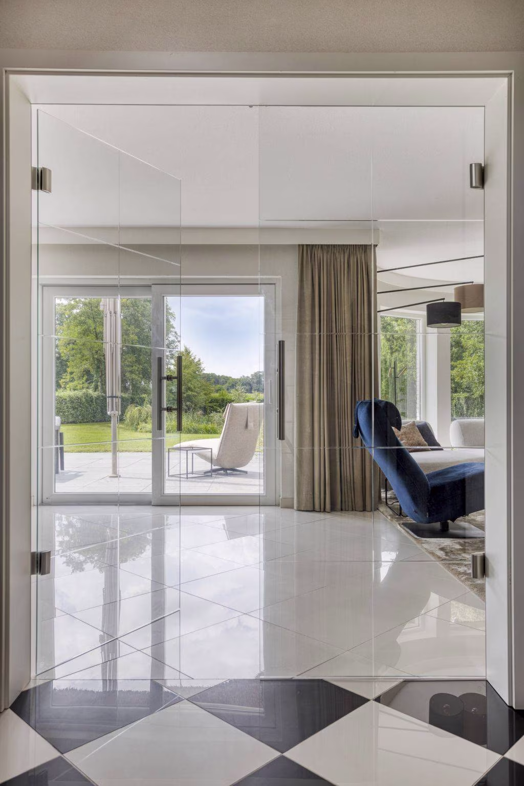 De sfeervolle woonkamer met erker is voorzien van grote raampartijen en twee schuifpuien die toegang geven tot de prachtig aangelegde tuin. Hierdoor baadt de ruimte in daglicht. Een gashaard zorgt voor extra gezelligheid, terwijl vloerverwarming én -koeling in de hele woning garant staan voor maximaal comfort, het hele jaar door.