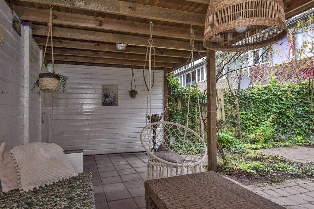 Tuin: zonnige achtertuin met groen uitzicht, privacy, houten overkapping met poort. Aan de voorzijde een overkapping voor het stallen van de fiets of scooter en een stenen berging.