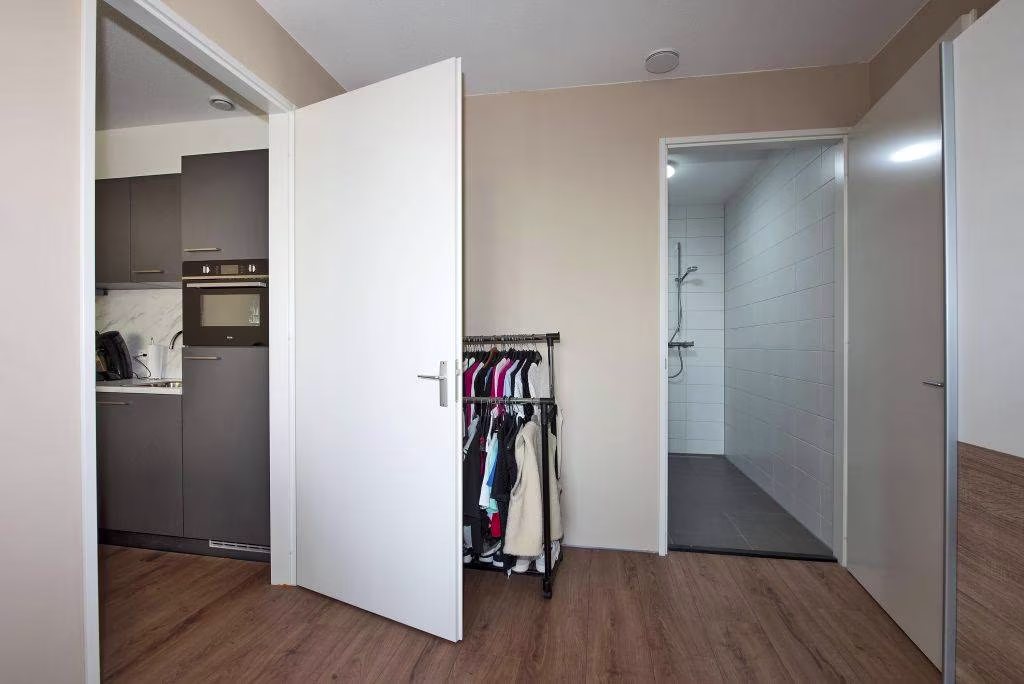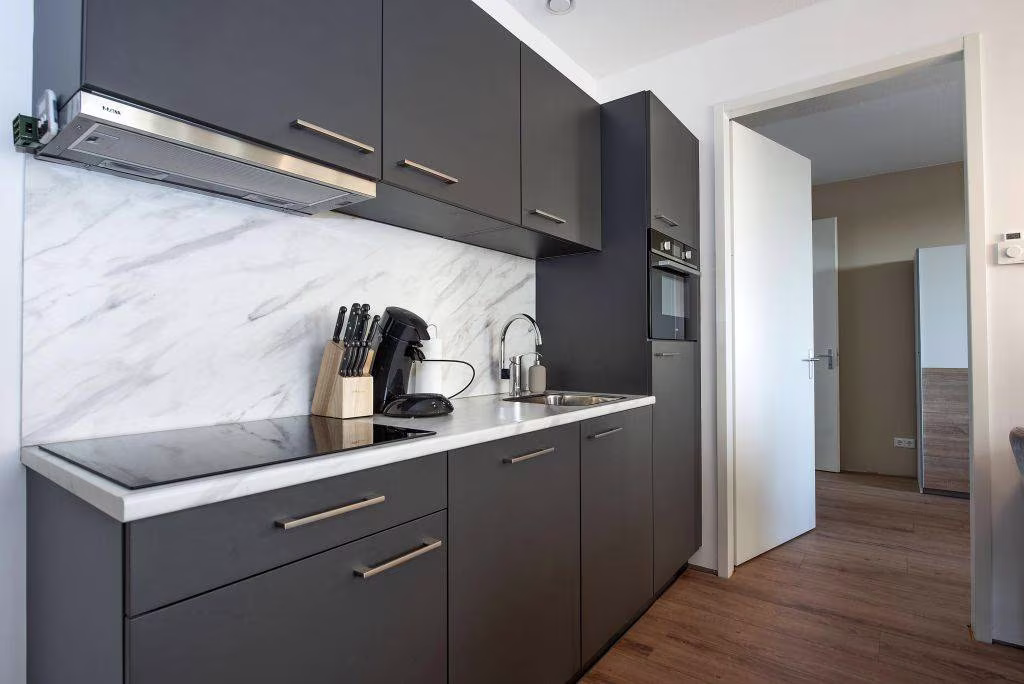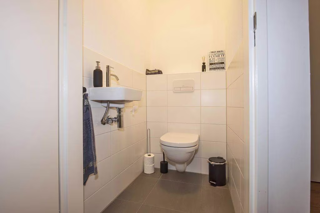 De keuken is modern uitgevoerd en praktisch ingericht, met voldoende werkruimte en een strakke uitstraling die past bij het jonge karakter van de woning. Of je nu snel iets klaarmaakt of uitgebreid kookt, hier doe je dat met gemak.