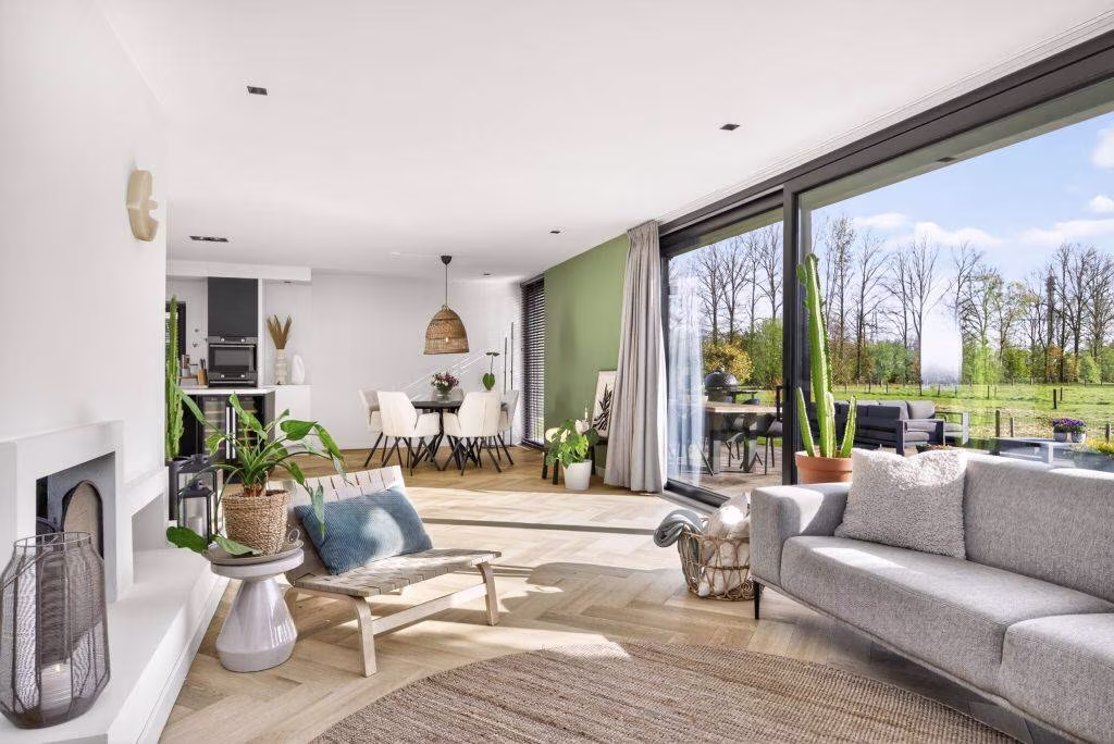 Je komt binnen in de ruime hal afgewerkt met een gietvloer met vloerverwarming, toiletruimte met hangend toilet met fontein en de meterkast. Vanuit de hal is de inpandig te bereiken ruime garage (27,5 m2), het tochtportaal/berging met opstelplaats CV-ketel en deur naar de tuin en de bijkeuken met aansluitingen witgoed te bereiken. Ook is er vanuit de hal toegang tot de gang met daaraan 3 slaapkamers voorzien van een gietvloer en de badkamer met een ligbad, inloopdouche, een hangend toilet en een wastafel met meubel. Wederom bereik je vanuit de entree/hal de fraaie woonkeuken en L-vormige woonkamer met ook een toegang naar de 4e ruime slaapkamer. Deze slaapkamer is voorzien van een PVC-vloer, airco en ook een directe toegang tot de badkamer. De prachtige woonkeuken is voorzien van een spoel- en kookeiland met barfunctie en een composiet aanrechtblad. De keuken is voorzien van inbouwapparatuur: inductiekookplaat met geïntegreerde afzuiging, koelkast, vaatwasser, 3-laden vriezer, een oven en een combi-oven en een klimaatkast. De woonkeuken staat in open verbinding met de ruime woonkamer afgewerkt met een PVC-vloer met vloerverwarming en biedt een open haard en een schuifpui naar het terras. Vanuit de woonkeuken en de woonkamer heeft u een prachtig weids uitzicht op groen en een zeer fraaie lichtinval door de situering op het zuidwesten!