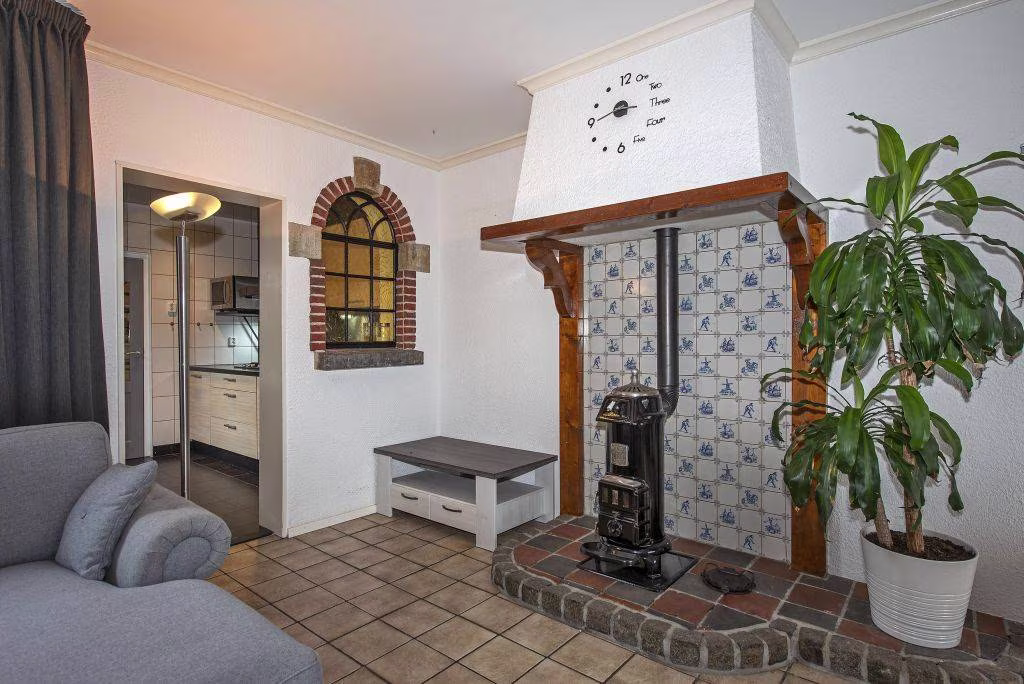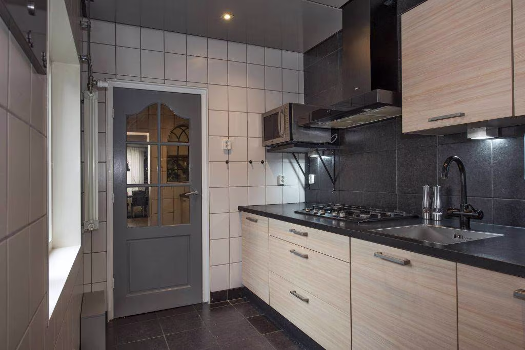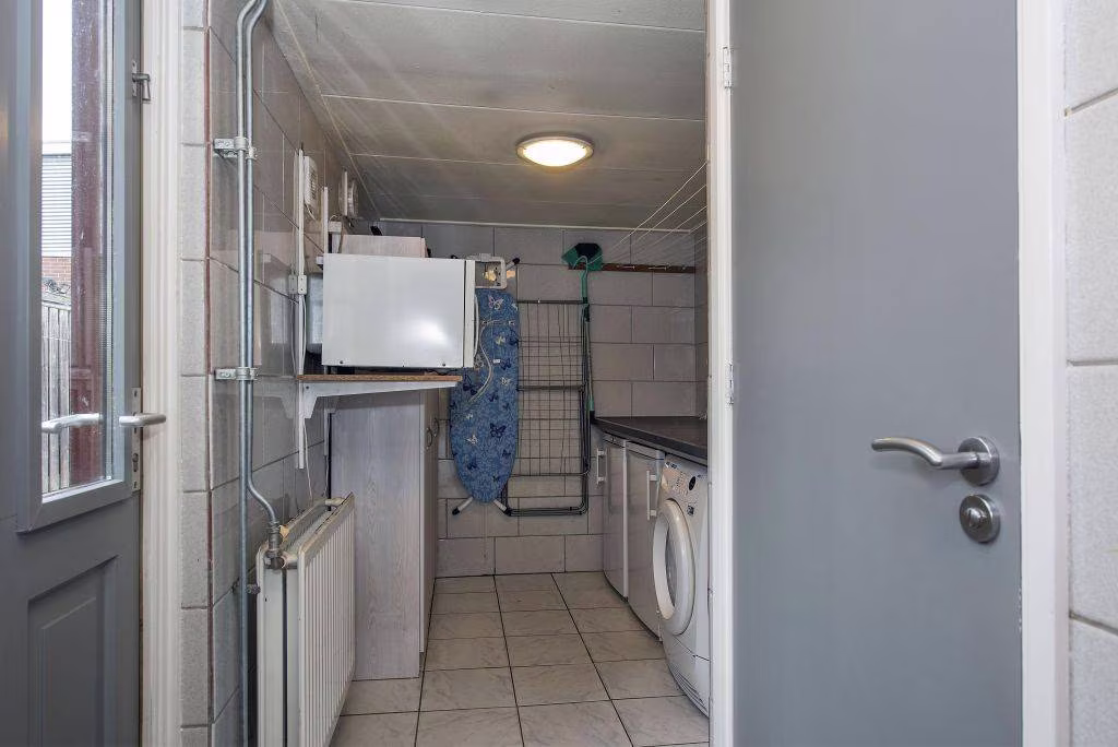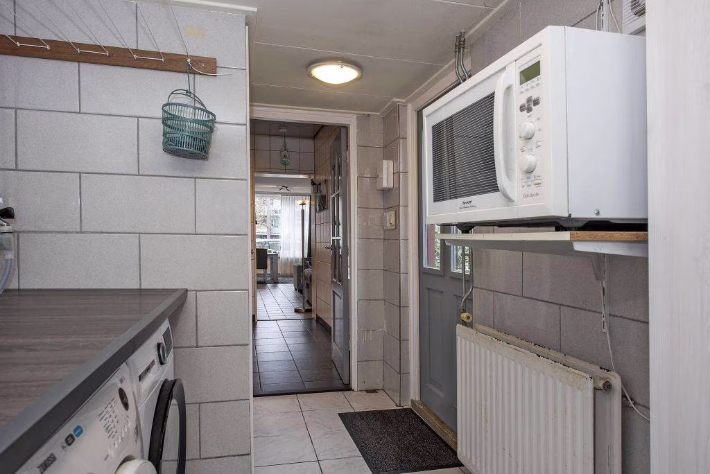 Aan de achterzijde ligt de halfopen keuken, verzorgd en functioneel in dagelijks gebruik. Vanuit de keuken loop je door naar de bijkeuken: een praktische ruimte met aansluiting voor wasmachine en droger, extra opbergmogelijkheden, het toilet én de doorgang naar de tuin.