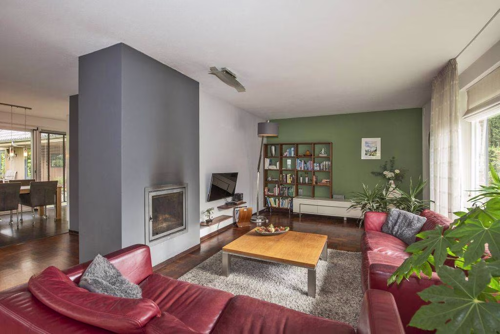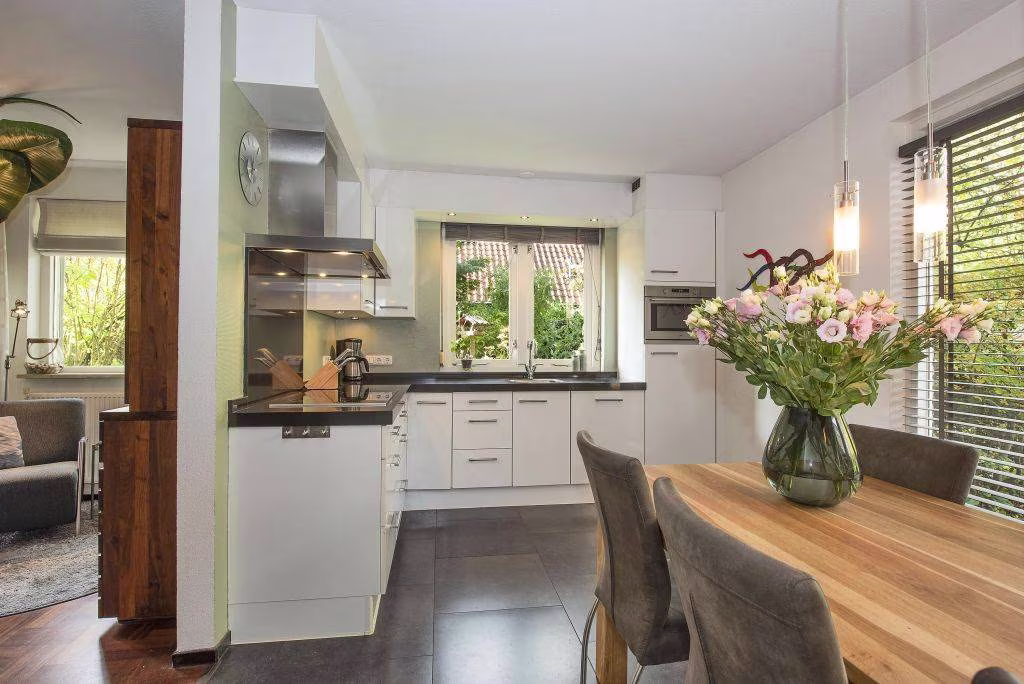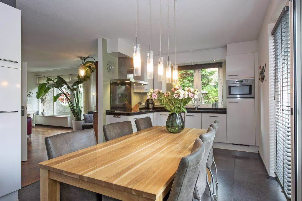 De woning zelf heeft een warme, sfeervolle uitstraling met een gezellige woonkamer en houtkachel. De tuingerichte keuken biedt prachtig uitzicht over het groen en vormt een fijne plek voor het gezin.