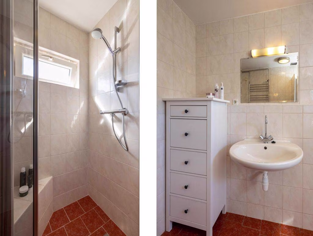 Overloop, drie slaapkamers en badkamer voorzien van inloopdouche, wastafel en toilet. Een tweede vaste trap brengt je naar de...