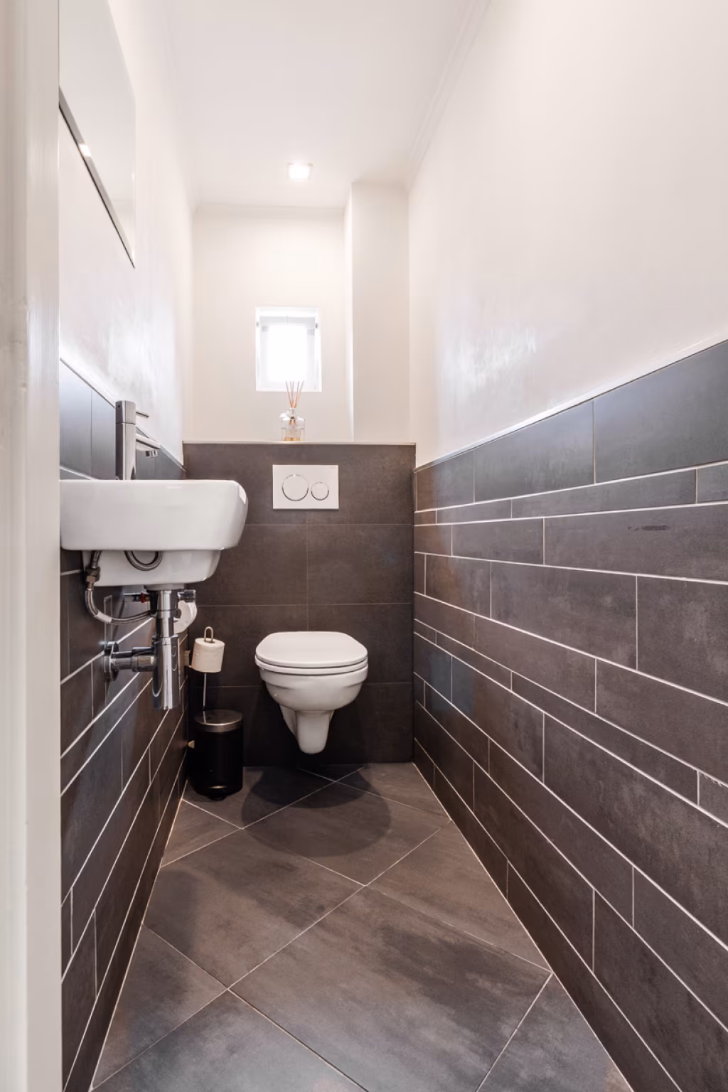 Tweede verdieping: overloop met tweede toilet welke volledig is vernieuwd, cv-opstelling en wasruimte, 3 slaapkamers, waarvan één is ingericht als walk-in closet.