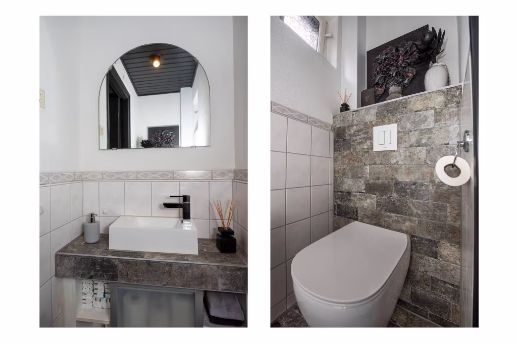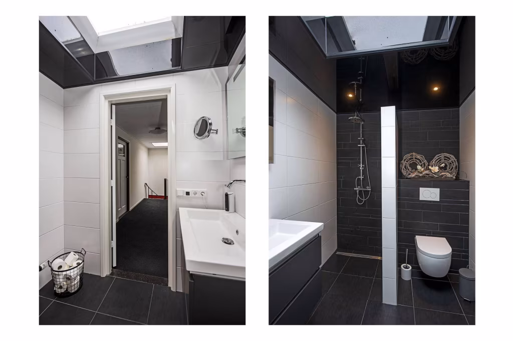 Eerste verdieping: royale overloop, een slaapkamer met wastafel, inpandig balkon en airco, 1 slaapkamer met wastafel en inpandig balkon, derde slaapkamer, (kleed)kamer; eenvoudig vierde slaapkamer van te maken, moderne badkamer met inloopdouche, wastafelmeubel en 2de toilet.