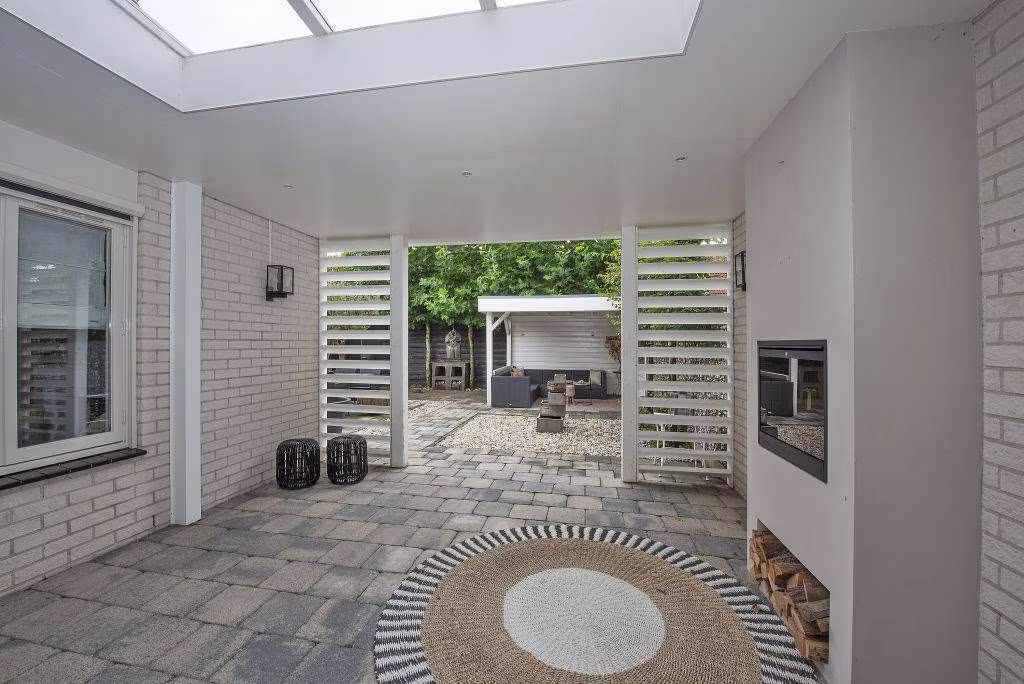 - Aangebouwde overkapping (± 20 m²) met lichtstraat en sfeerhaard;