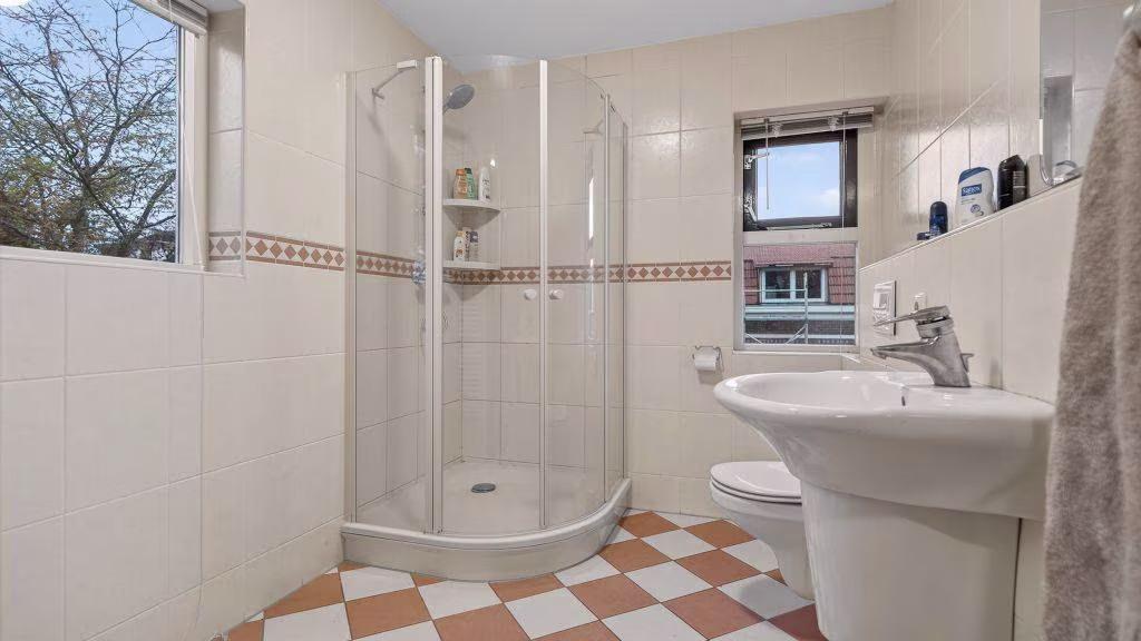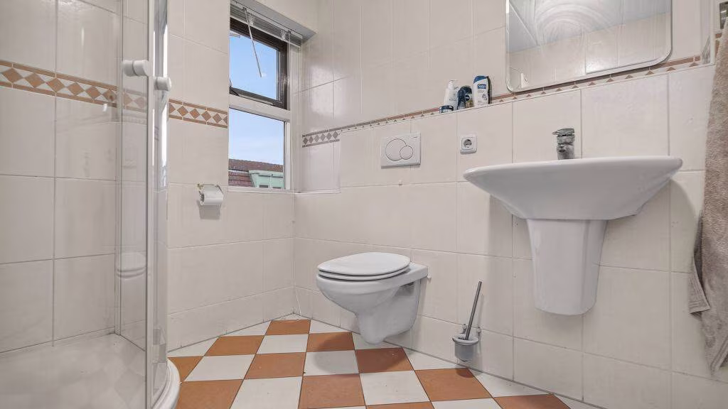 Overloop, 3 ruime slaapkamers, nette badkamer met douche, wastafel en hangtoilet.